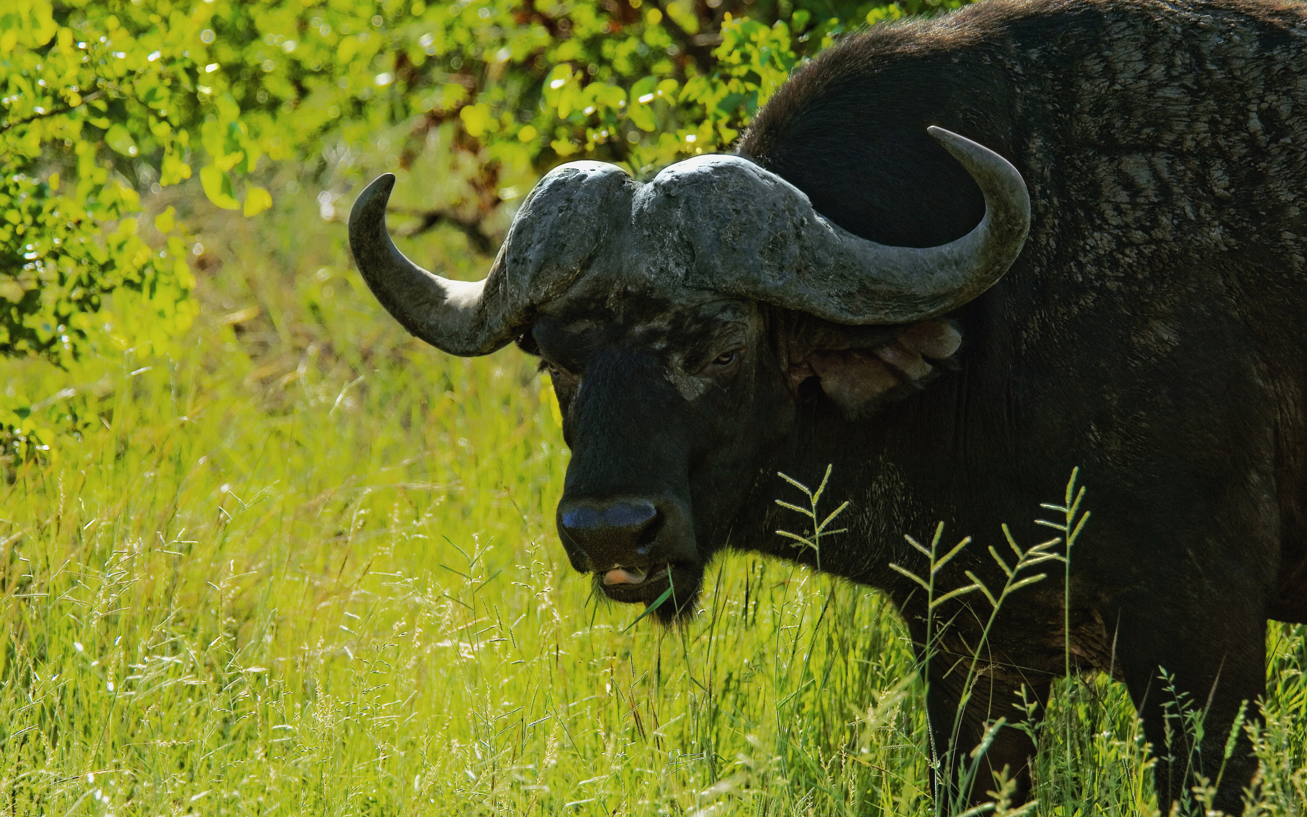 Description: A bull with large horns standing in a field of tall grass and weeds with trees in the background and bushes in the foreground.