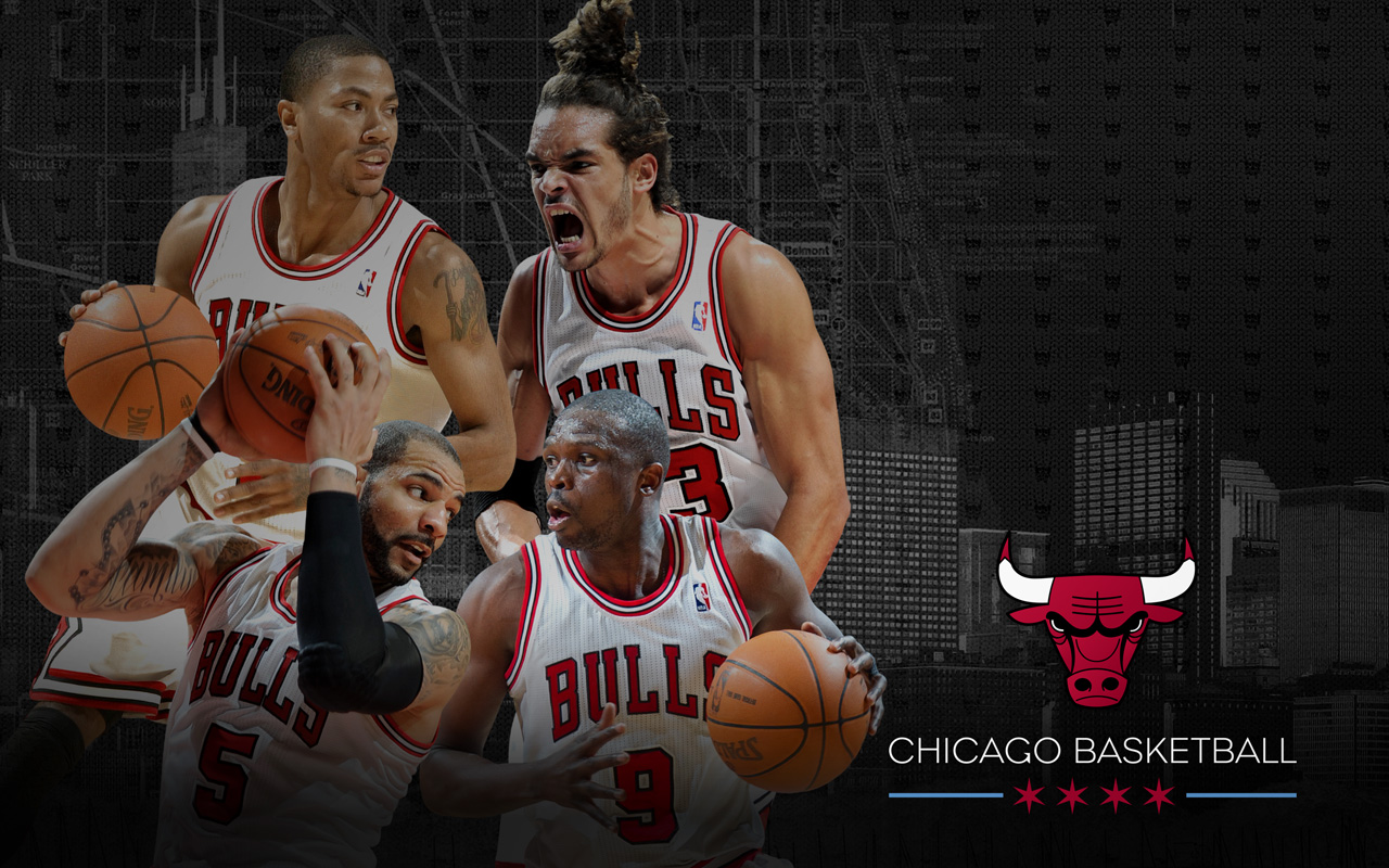 Description: A group of bulls basketball players standing next to each other with a bulls logo on the side of the photo.