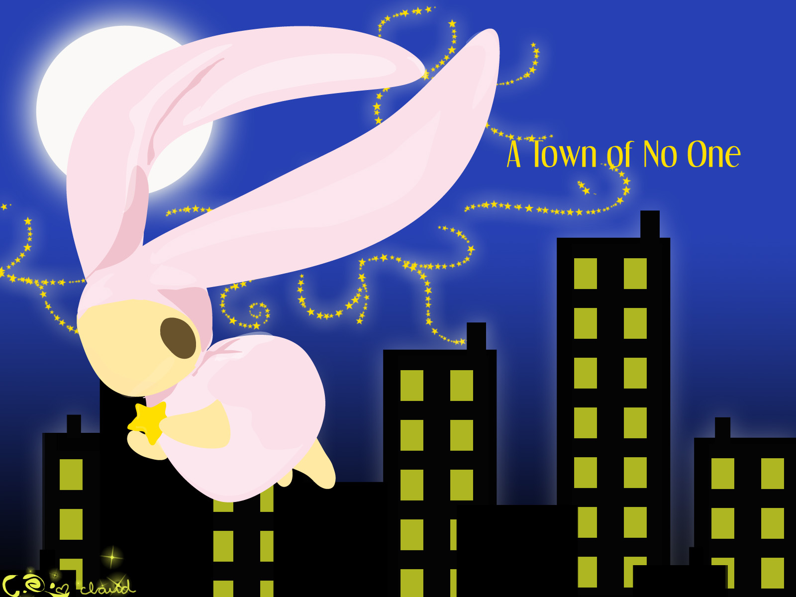 Description: A cartoon bunny flying through the air over a city at night with a town of no one written below.
