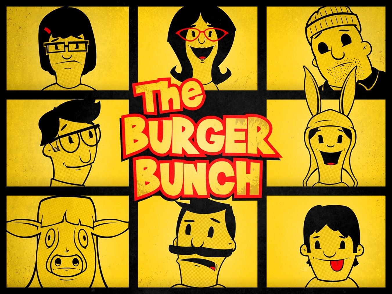 Description: A cartoon of a bunch of people with the words the burger bunch on them in red and yellow colors.