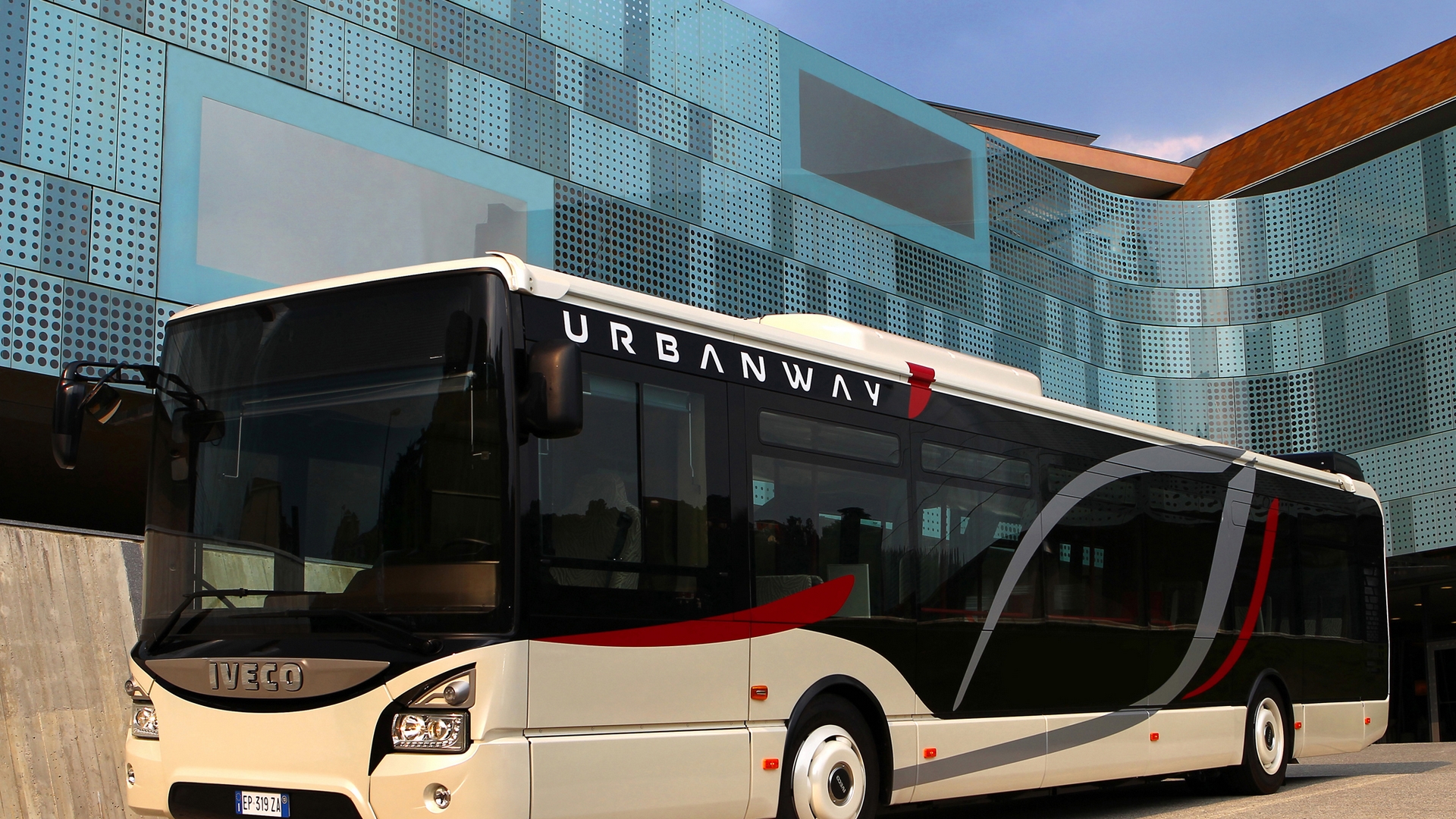 Description: A bus parked in front of a building with a large window on the side of it's side.