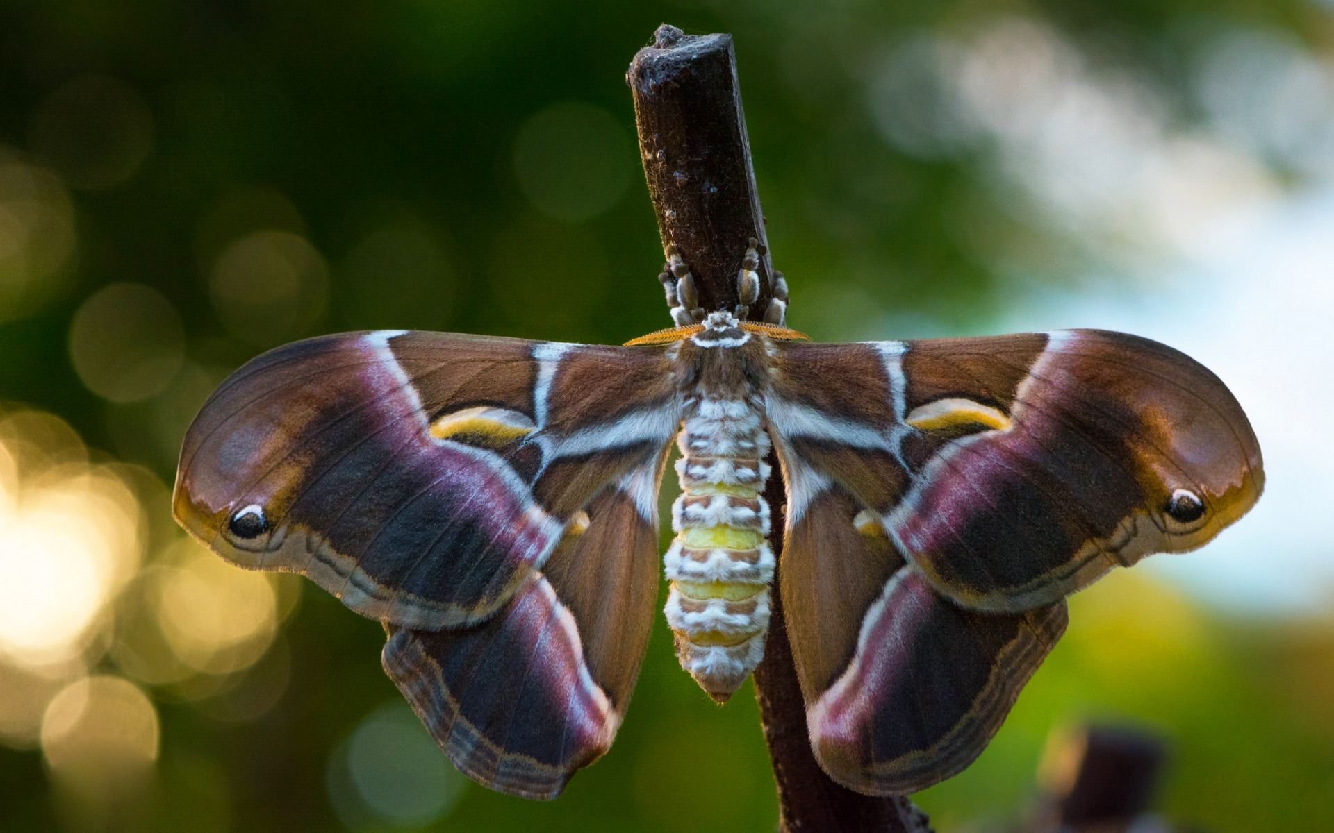 Description: A large brown and white butterfly hanging from a branch with a blurry background of trees and grass in the background.
