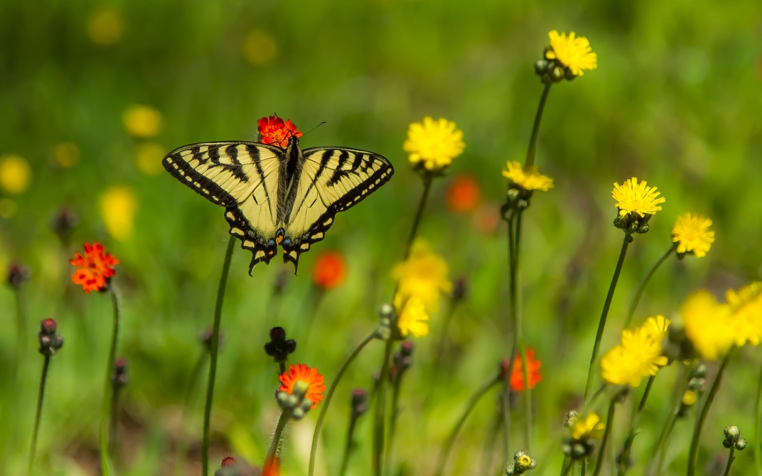 Description: A butterfly sitting on a flower in a field of flowers and grass with yellow and red flowers in the background.