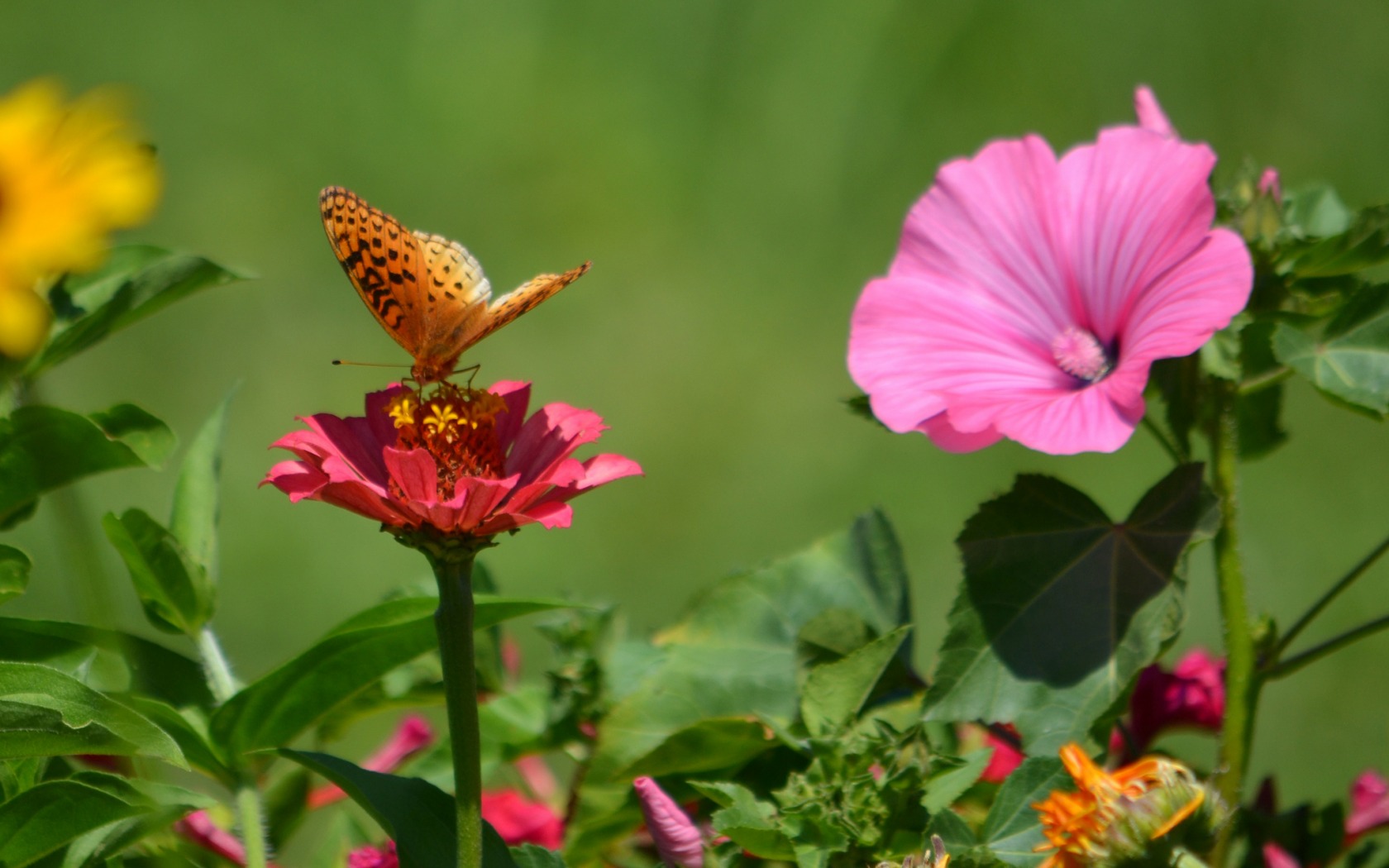 Description: A butterfly sitting on a flower in a field of flowers with a green background and a pink flower in the foreground.