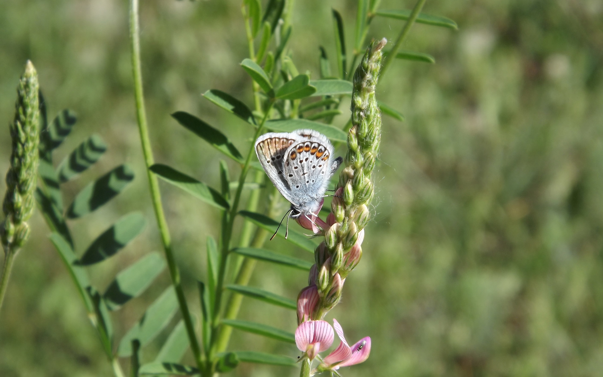 Description: A butterfly is sitting on a flower in a field of grass and flowers in the foreground.