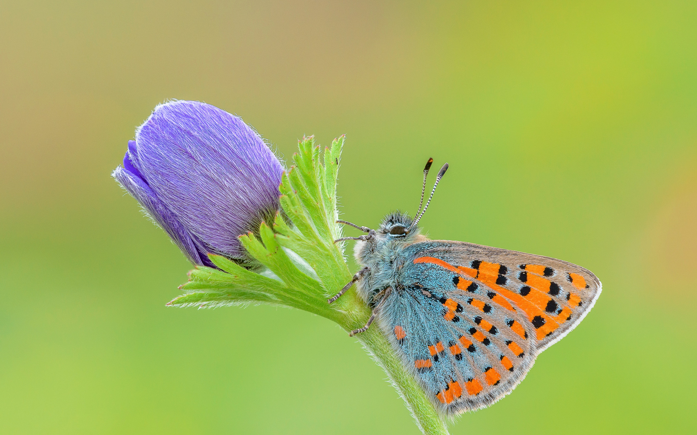 Description: A butterfly sitting on a flower with a blurry background of grass and flowers in the background.
