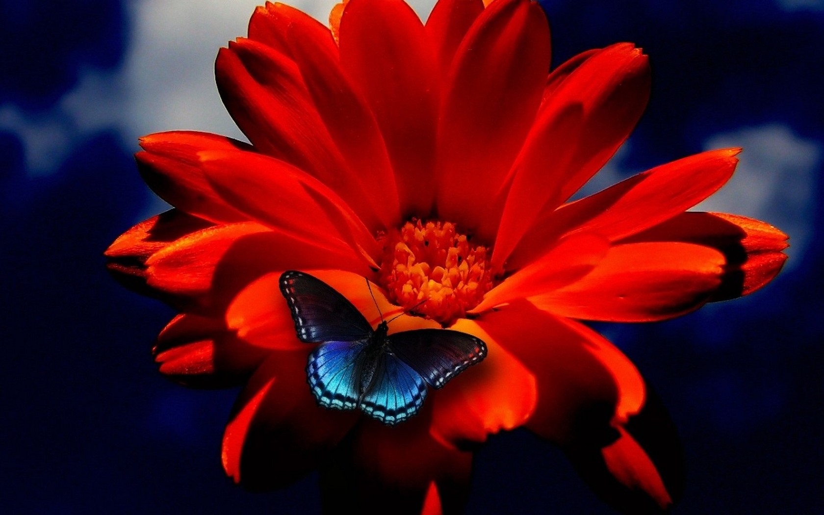 Description: A butterfly is sitting on a red flower with a blue background and clouds in the background.