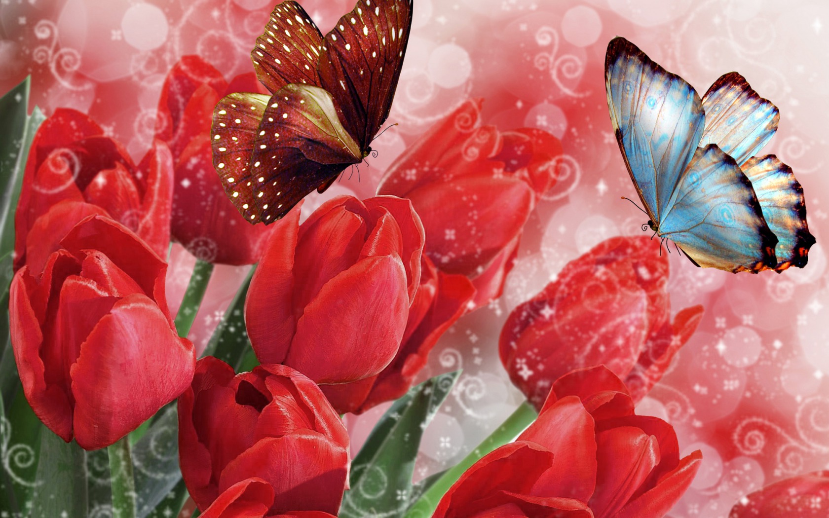Description: A butterfly flying over a bunch of red flowers with a swirly background behind it and a red tulip.