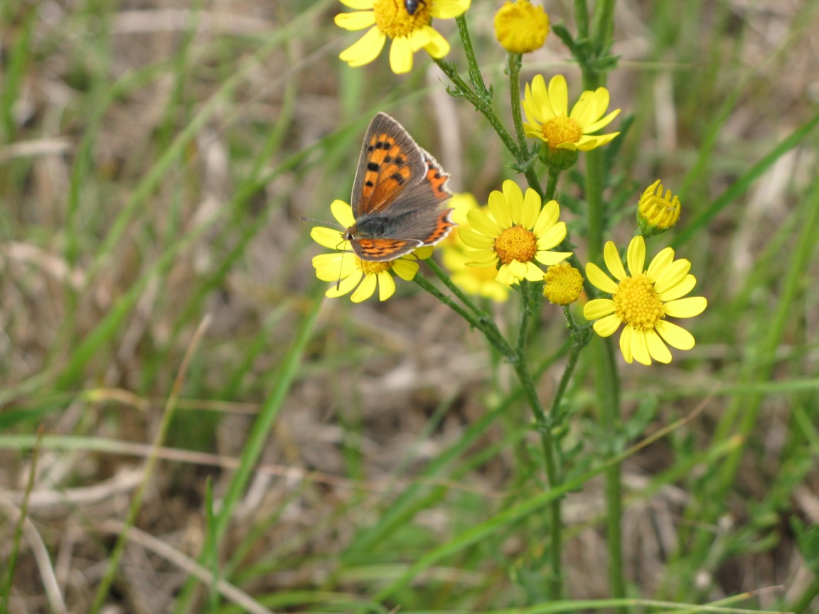 Description: A butterfly is sitting on a yellow flower in the grass and grass is growing in the background.