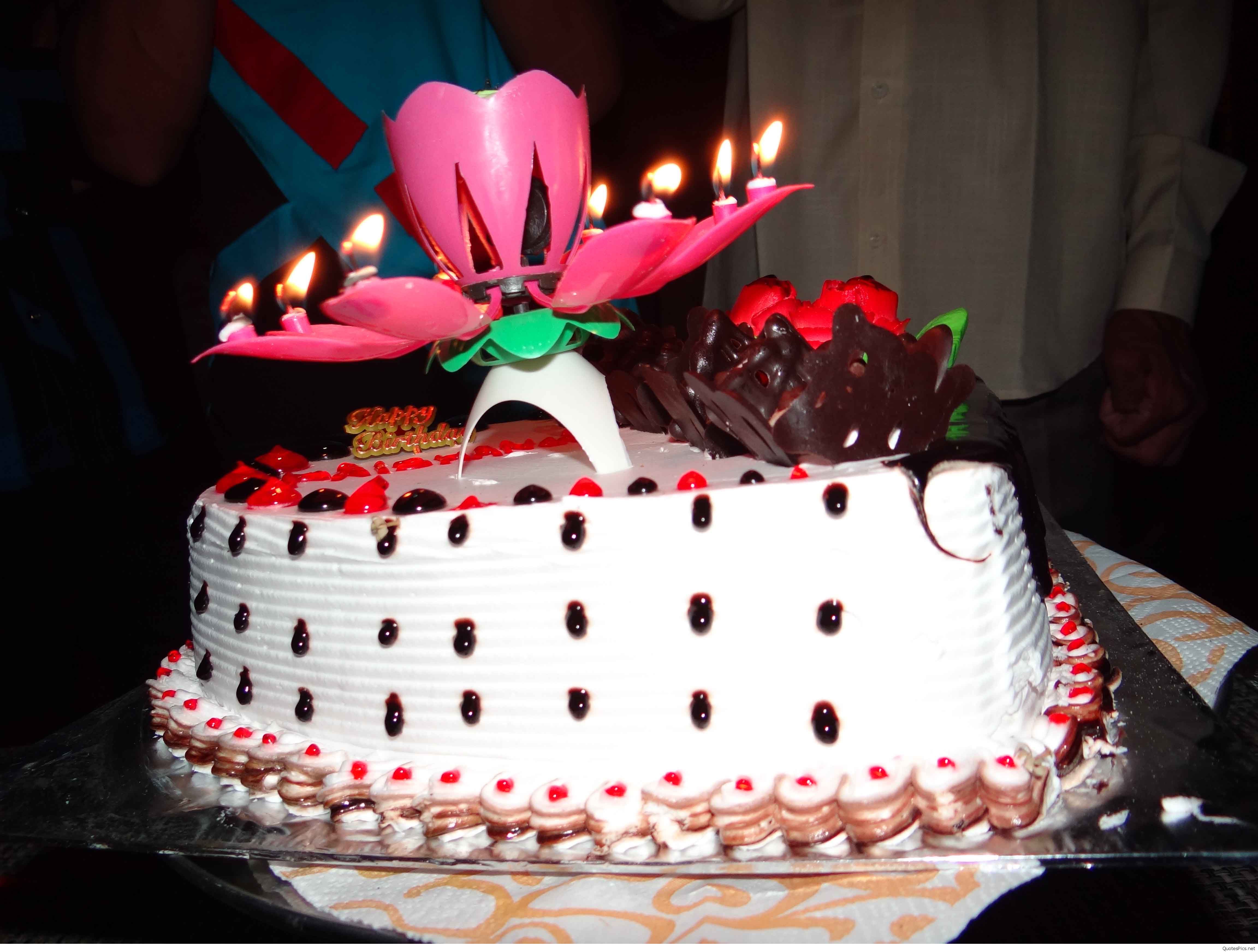 Description: A cake with candles on top of it on a table with a plate of food and a napkin on it.