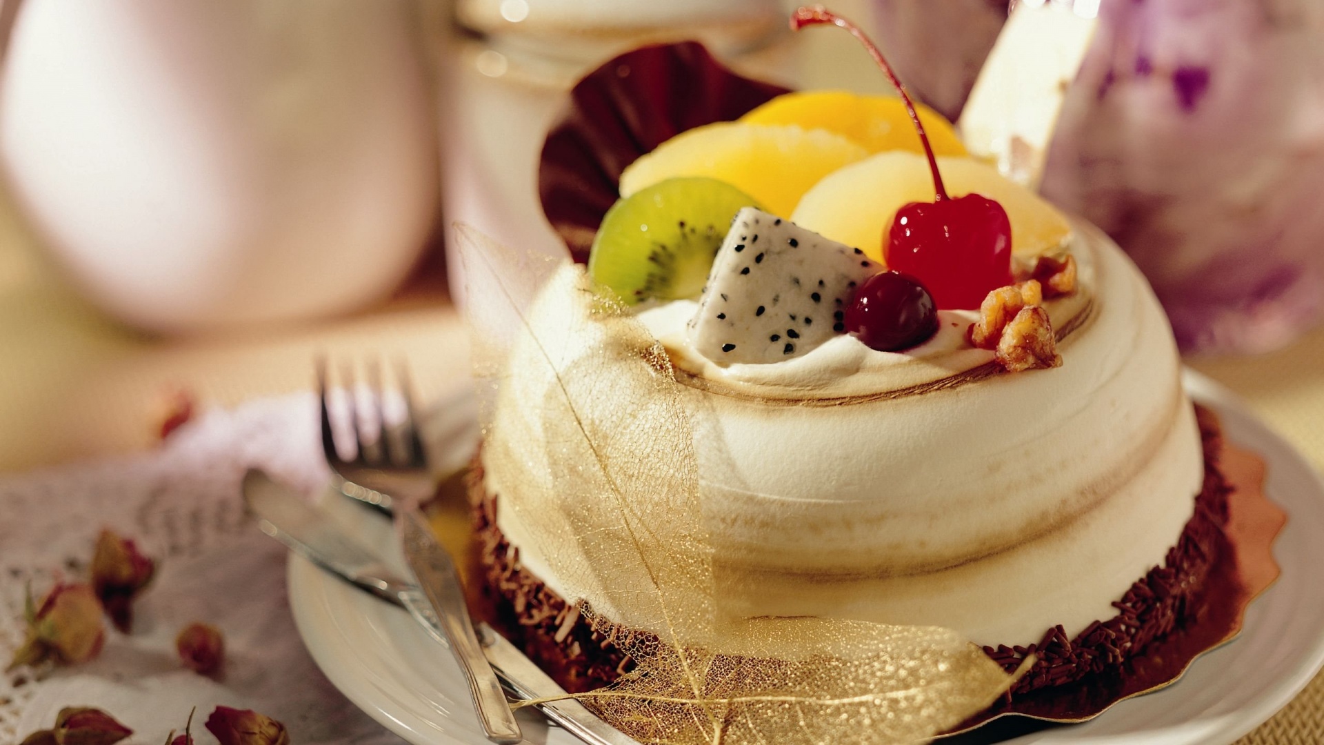 Description: A cake with fruit on top of it on a plate with a fork and a glass of wine in the background.