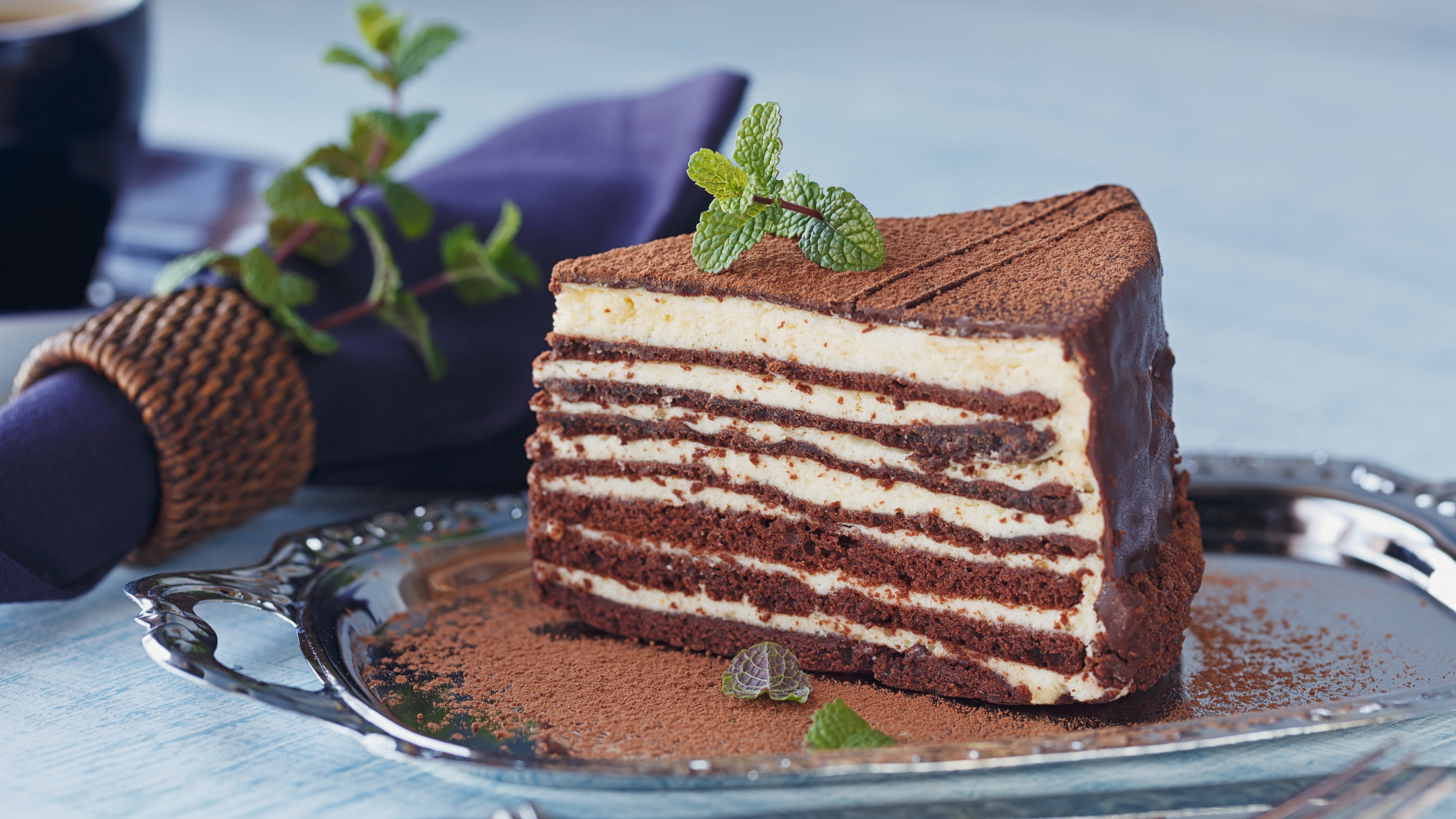 Description: A piece of cake on a plate with a fork and a cup of coffee in the background on a table.