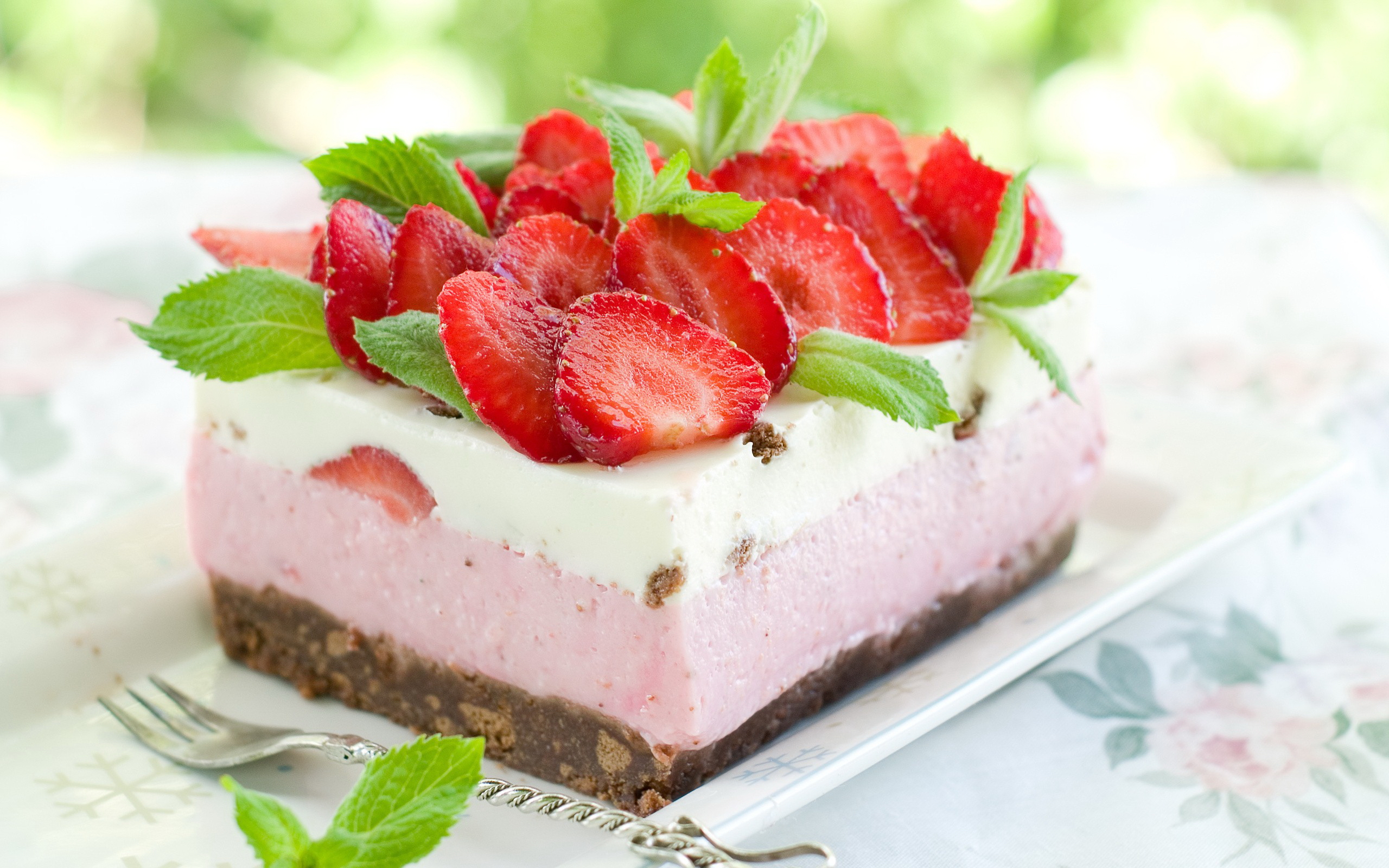 Description: A piece of cake with strawberries on top of it on a plate with a fork and a spoon.