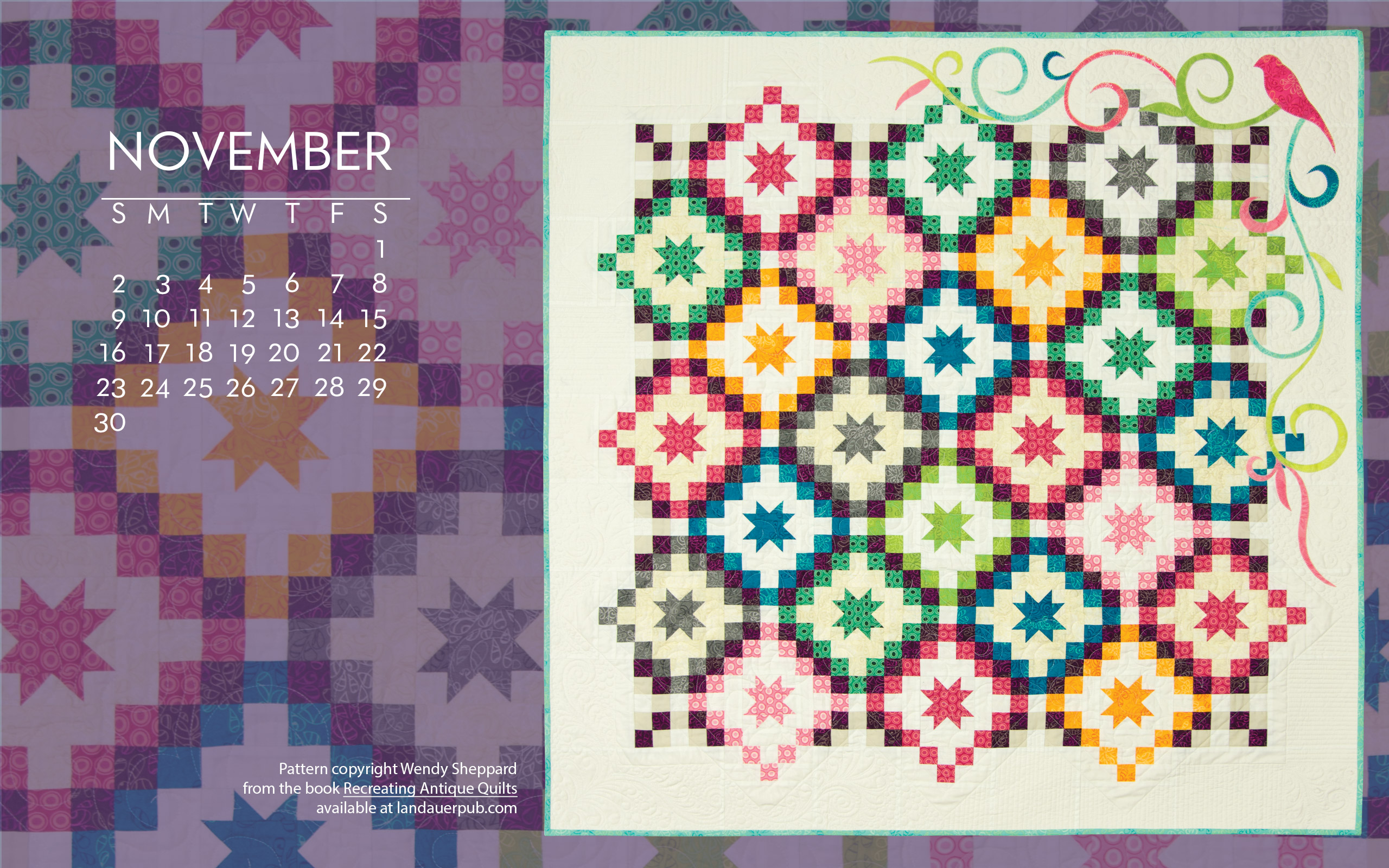 Description: A calendar with a quilt on it and a bird on the cover of it.