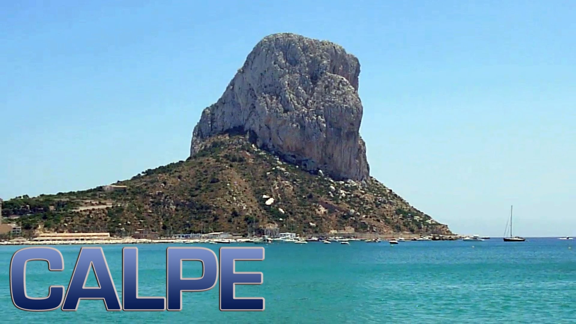 Description: A large rock in the middle of a body of water with a boat in the background and a caption that reads calpe.