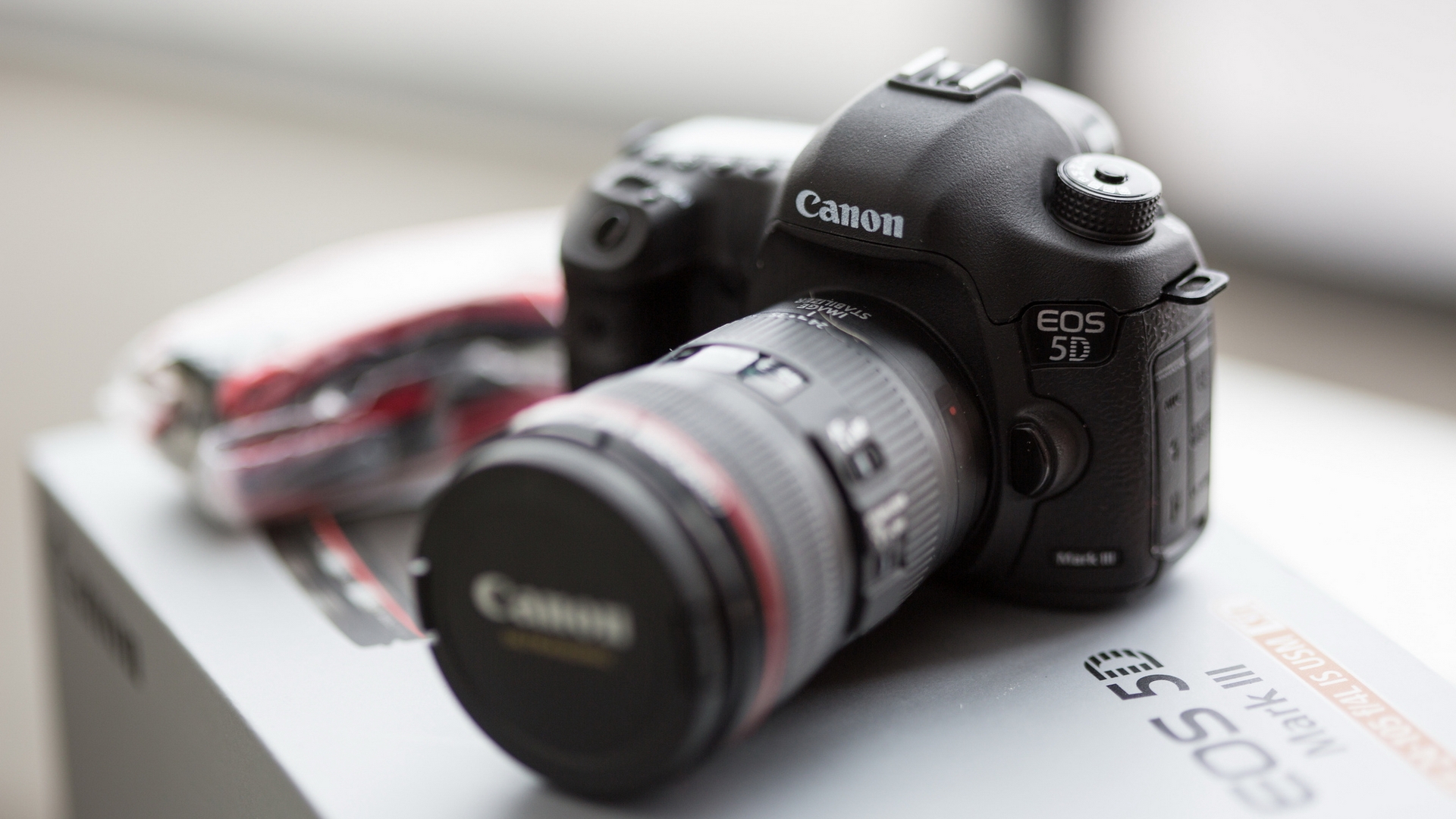 Description: A camera sitting on top of a card with a lens attached to it's body and a lens cap on top of it.