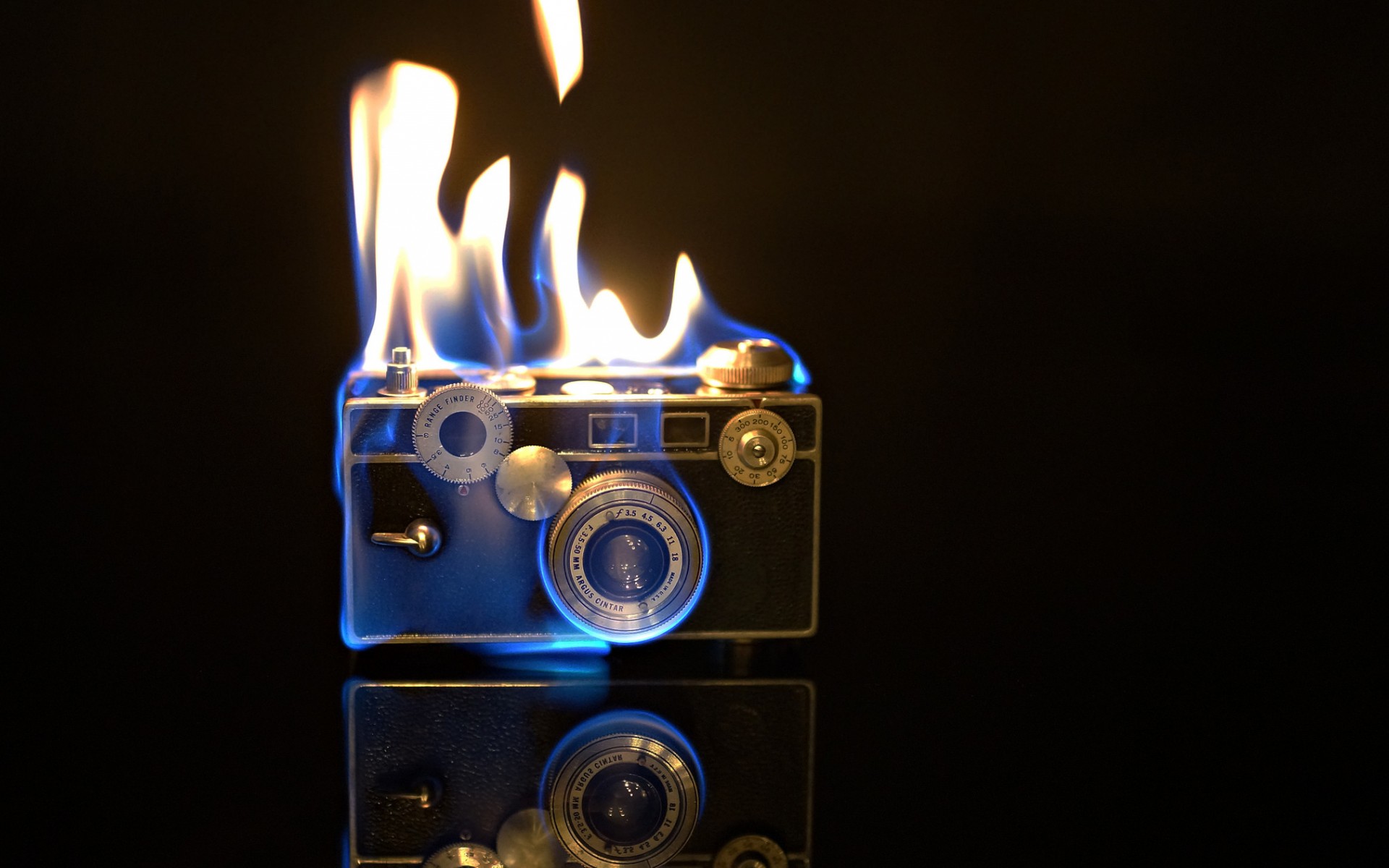 Description: A camera with flames on it sitting on a table top with a black background and a reflection of the camera.