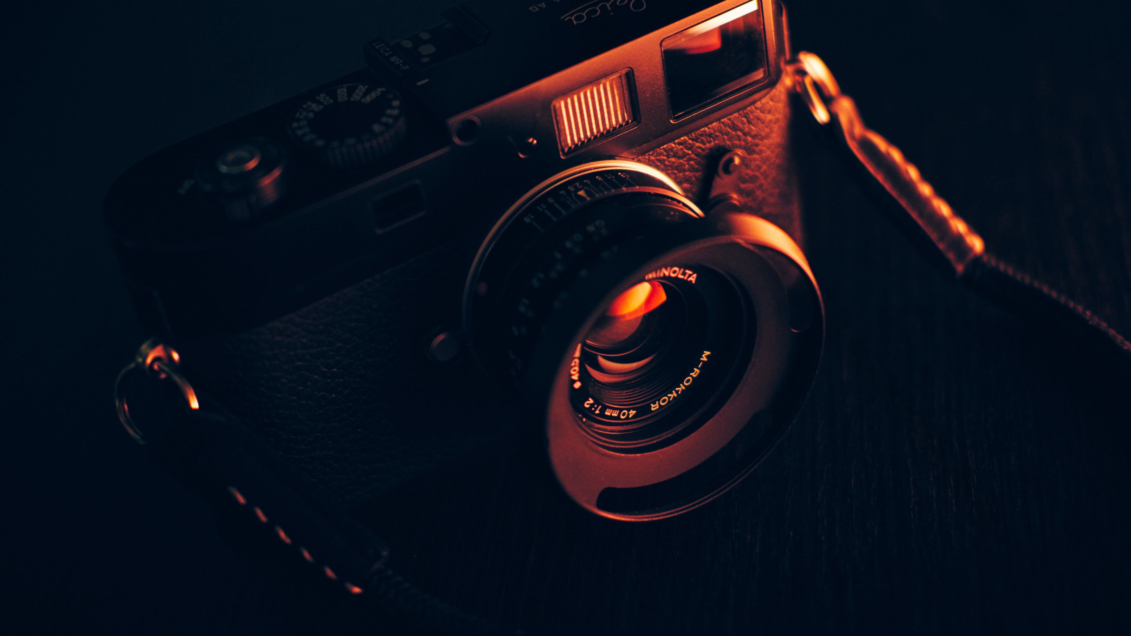 Description: A camera with a flash lens attached to it's body and a strap around it's neck.