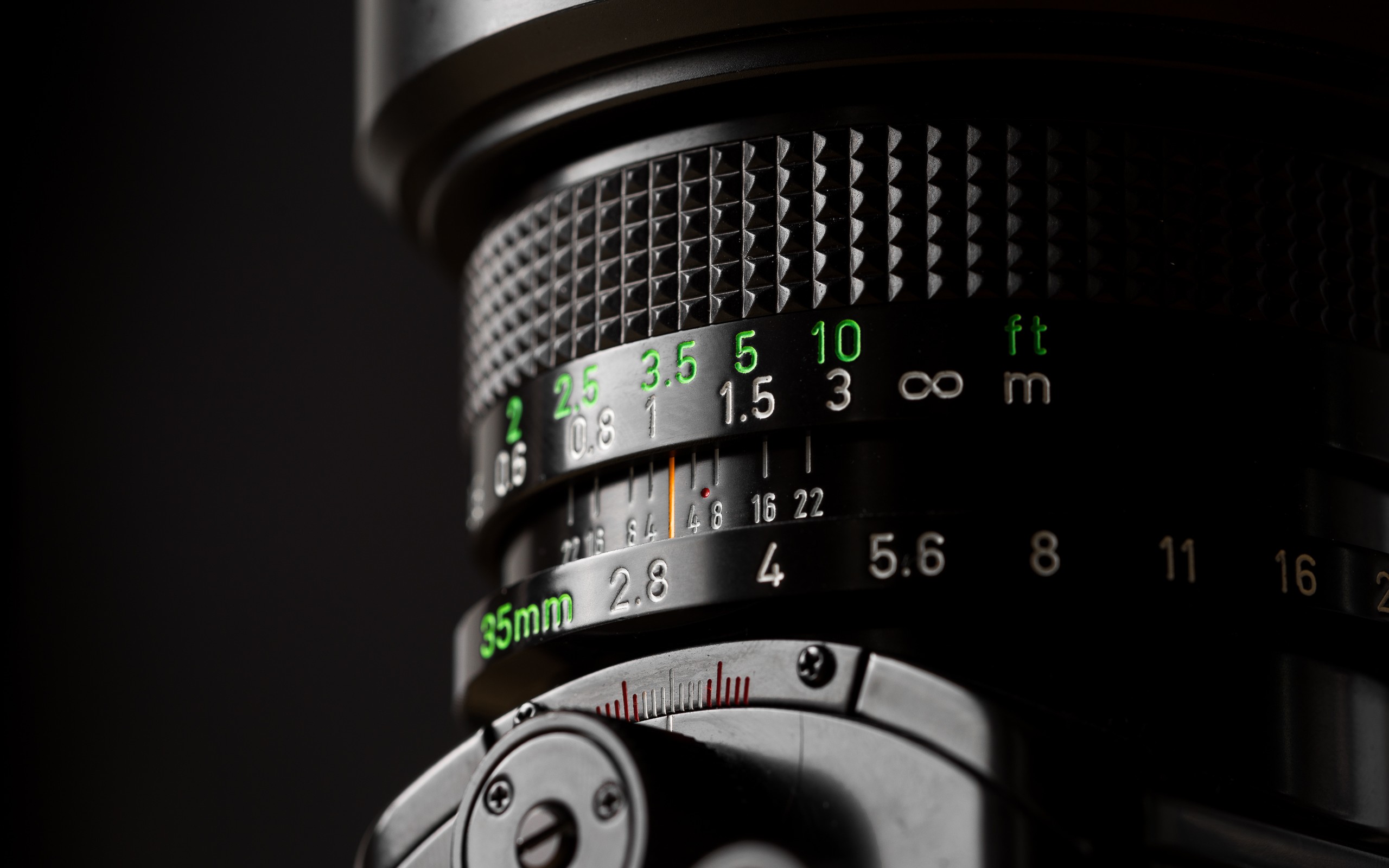 Description: A close up of a camera lens with a black background and a white background with a green and black stripe.