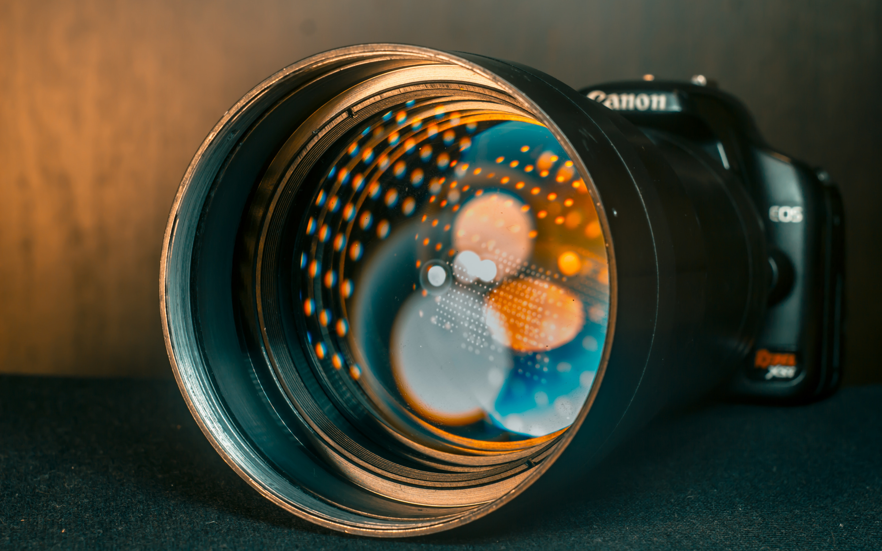 Description: A camera lens with a reflection of a flower on it's side and a blurry background of a flower.