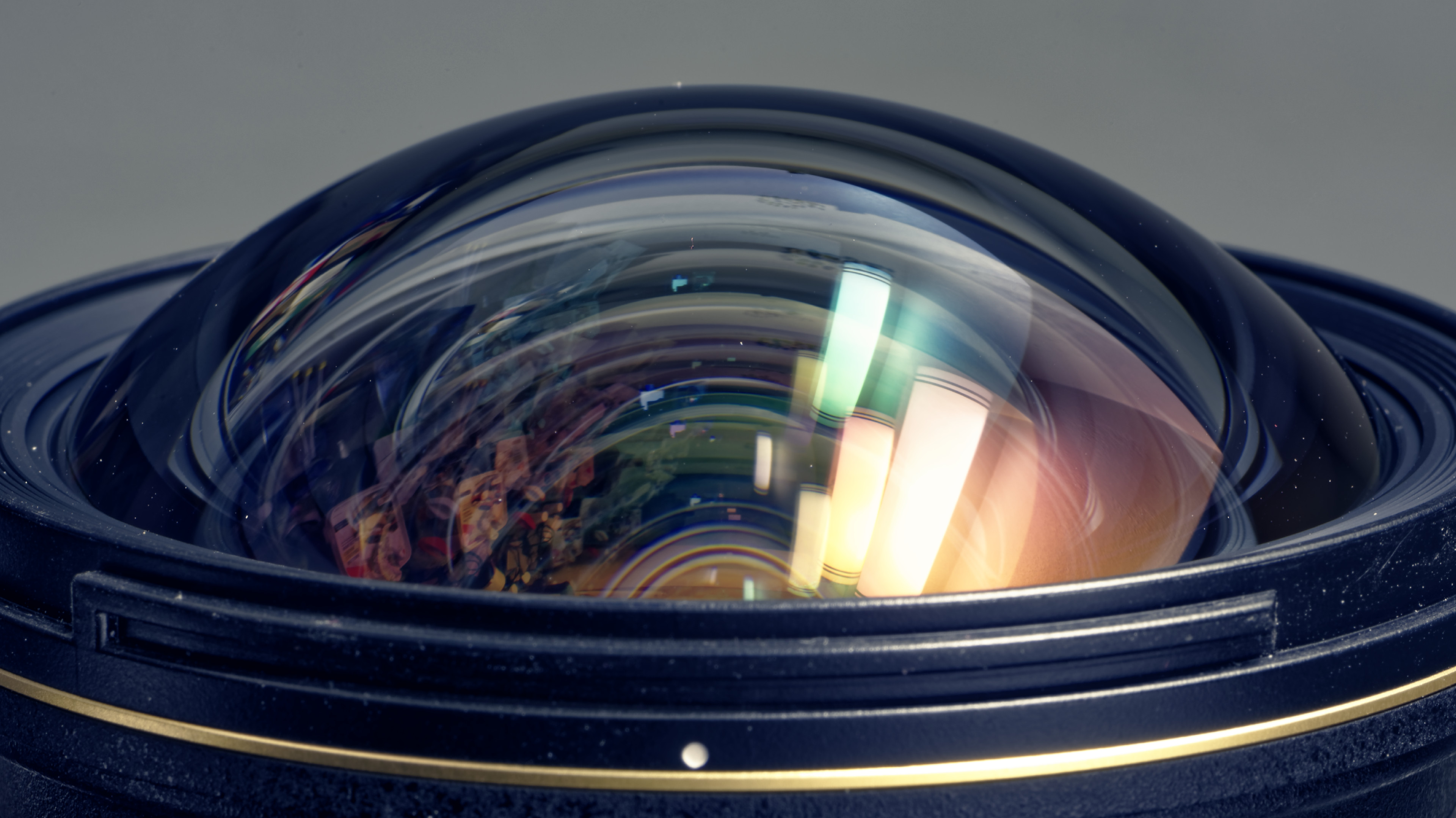 Description: A close up of a camera lens with a blurry image of a building in the background and a gold stripe around the lens.