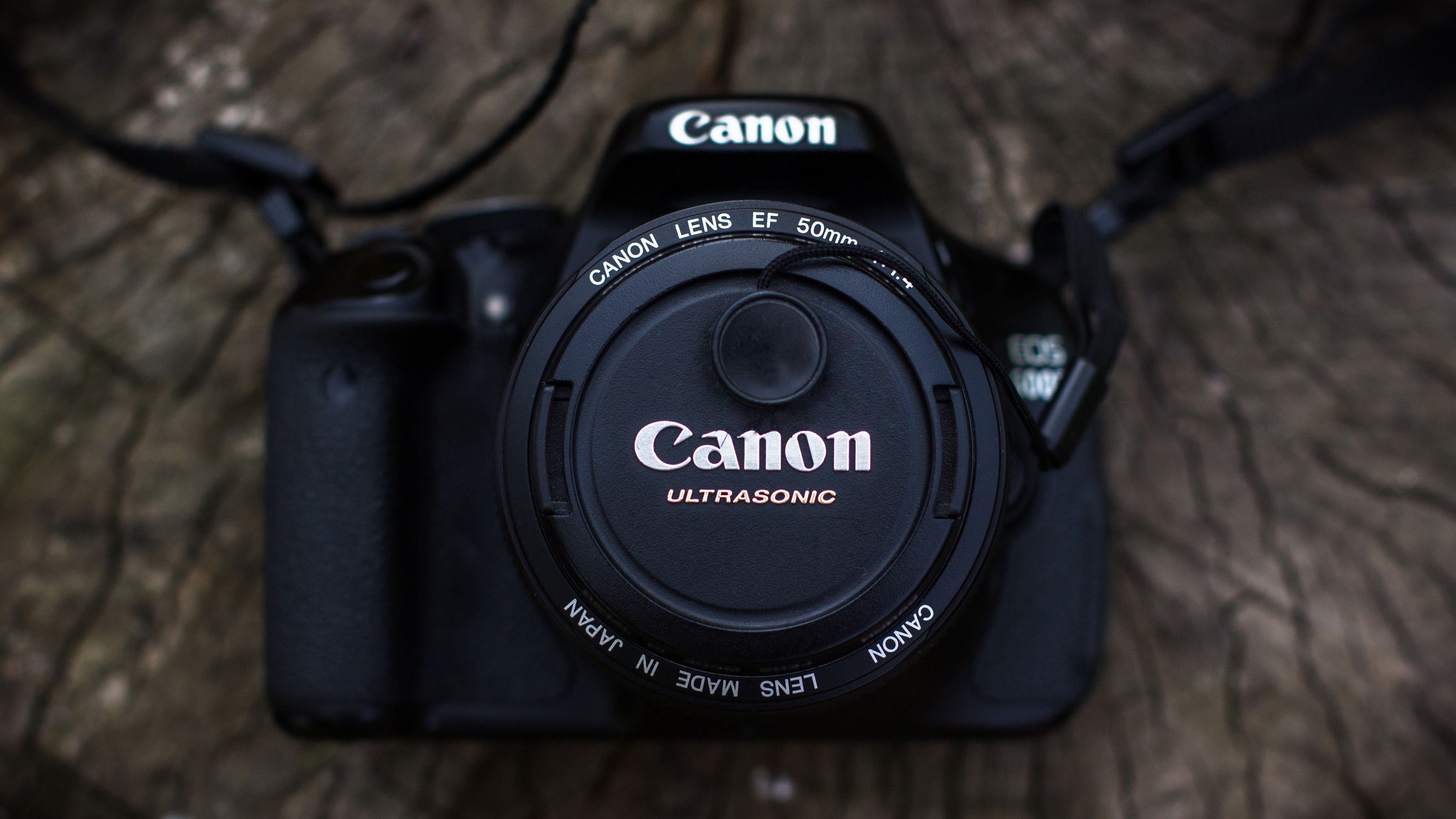 Description: A camera with a lens attached to it sitting on a tree trunk with a cord attached to it and a lens attached to the camera.