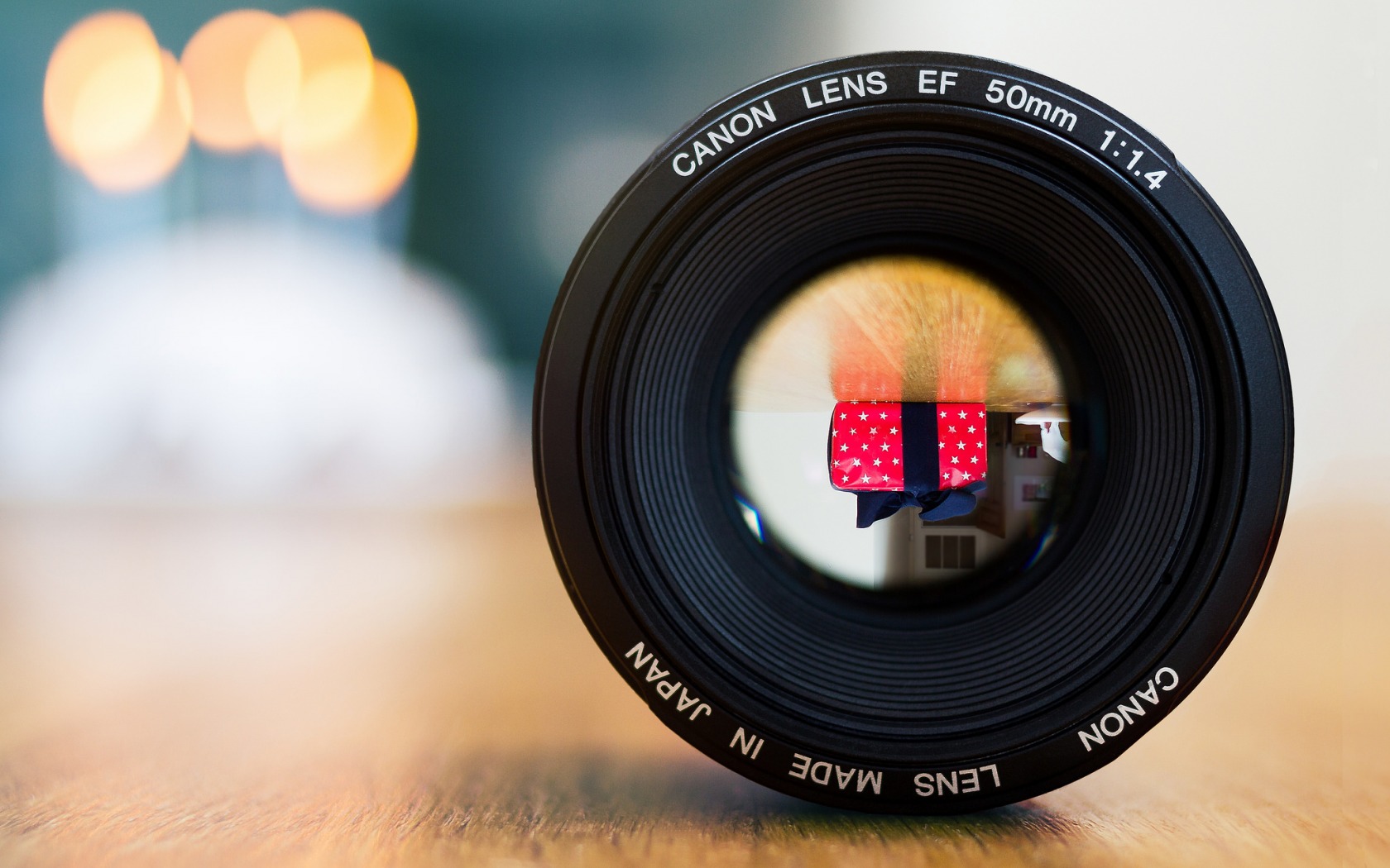 Description: A camera lens with a reflection of a house in it's lens cap on a table with a blurry background.