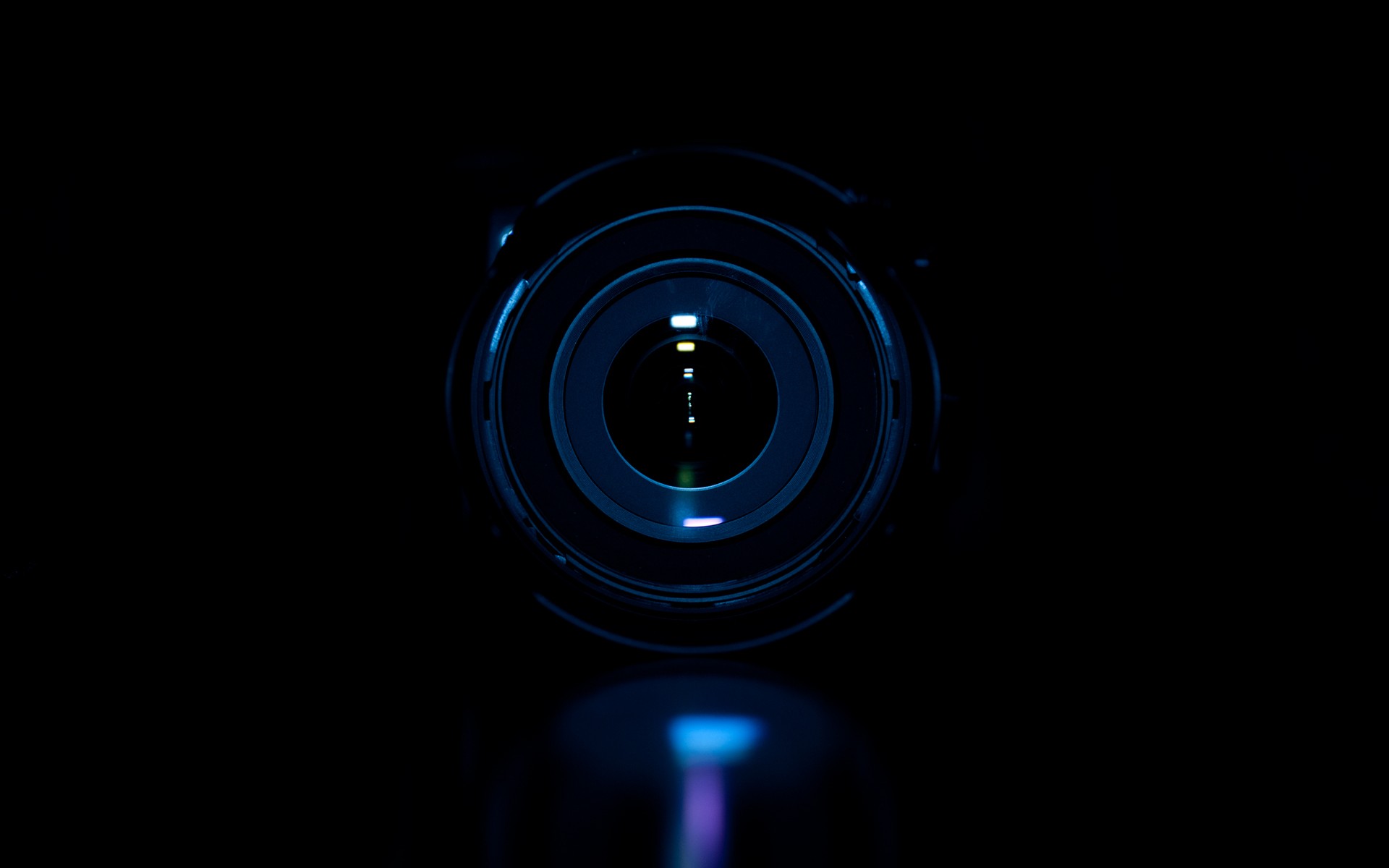 Description: A camera lens with a reflection of a light in it's center and a dark background with a light at the end of the lens.