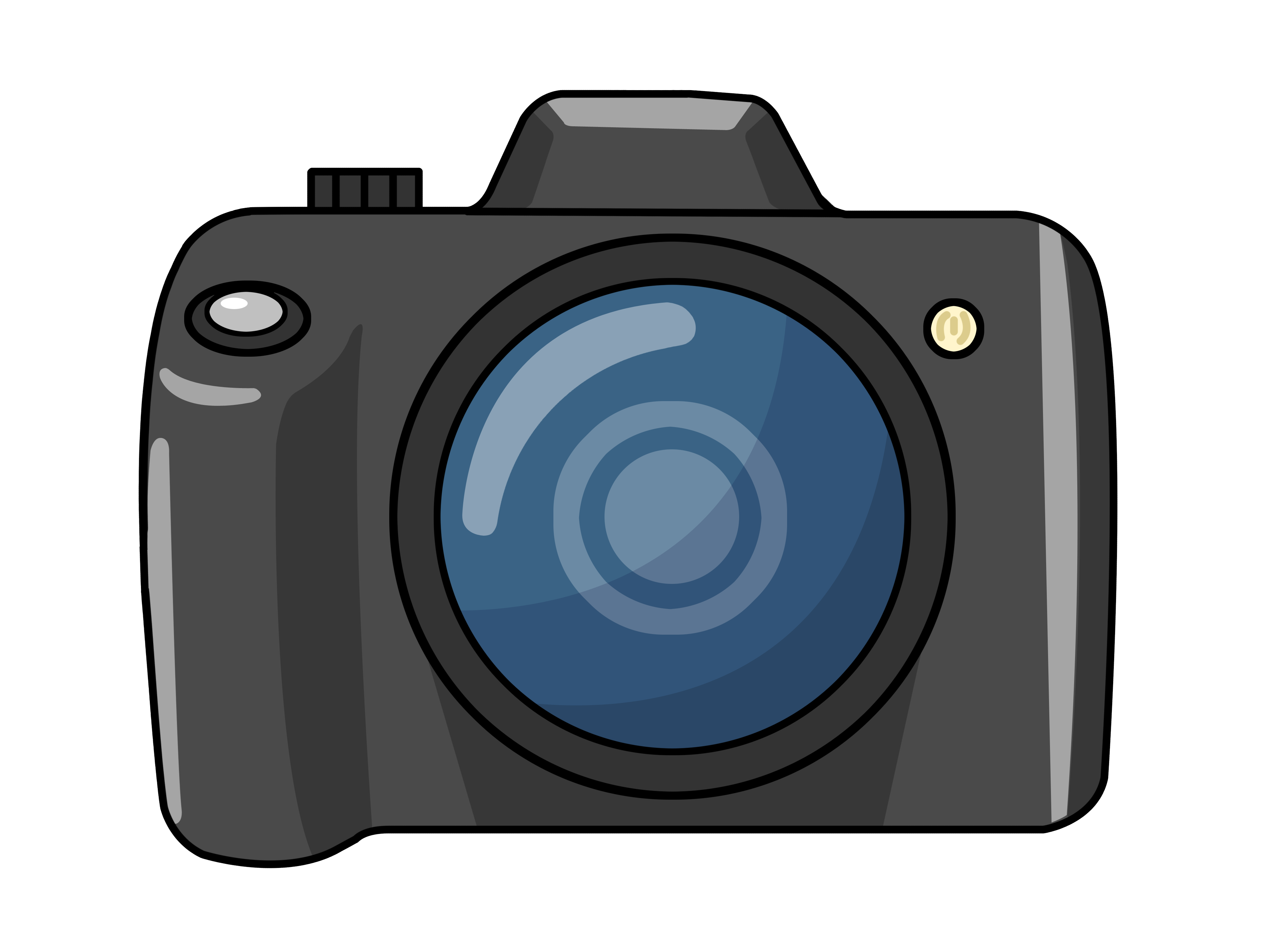 Description: A camera with a lens on it's side and a white background with a black outline of the camera.