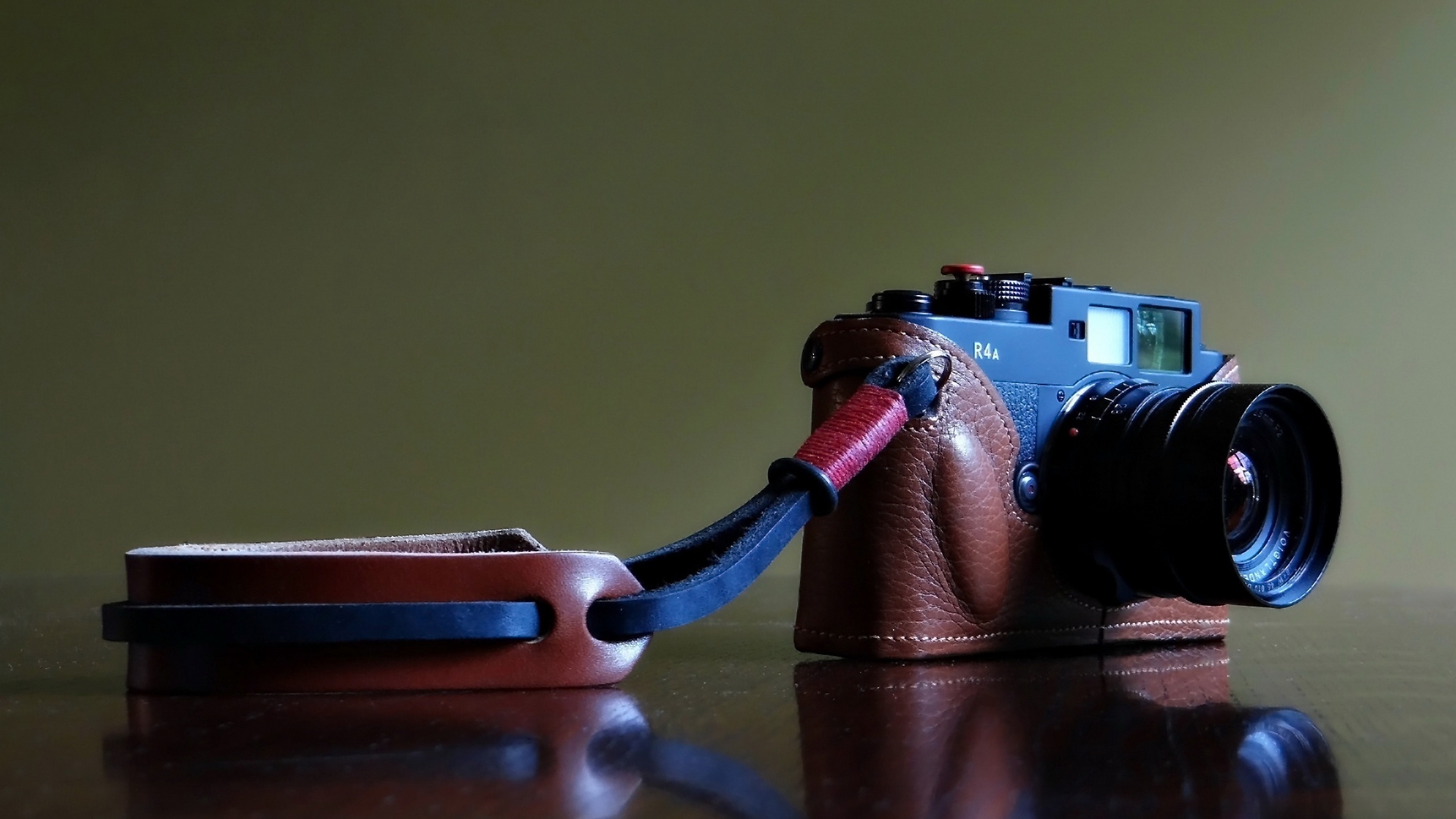 Description: A camera with a strap attached to it sitting on a table with a green wall behind it and a black lens.