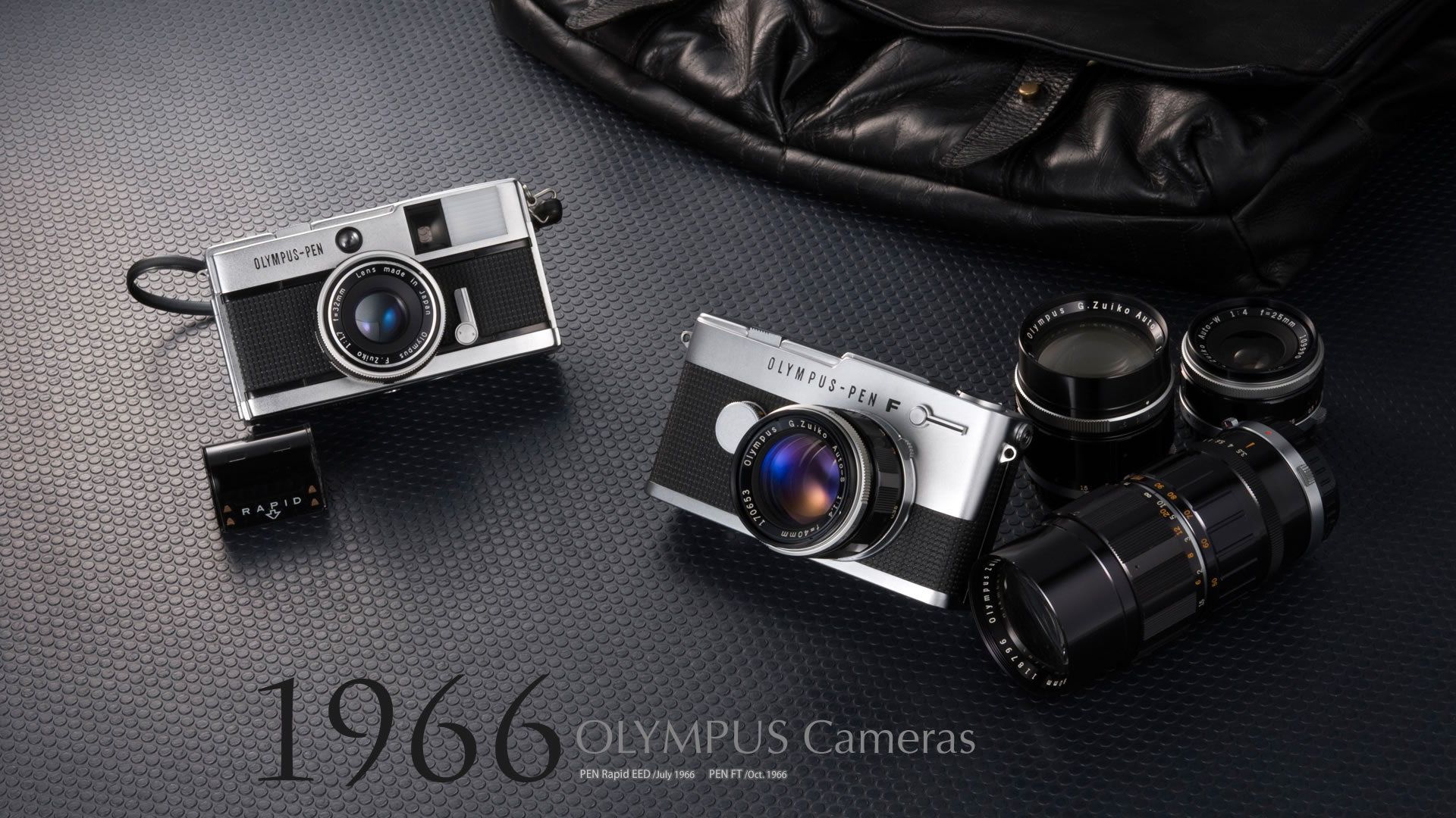 Description: A camera and some other items on a table with a bag and a camera on it's side.