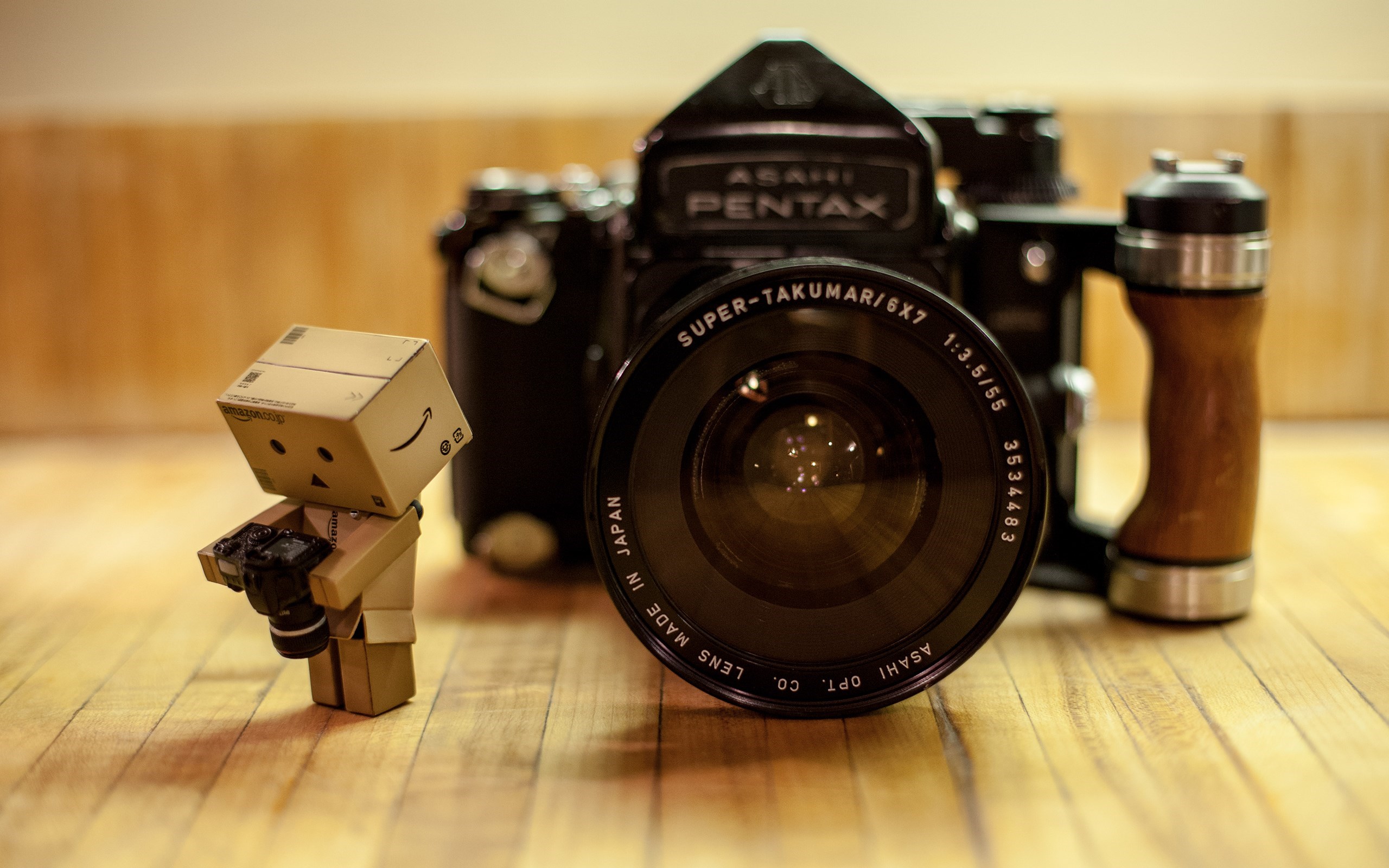 Description: A camera and a toy are on a table next to a camera and a camera lens and a camera.
