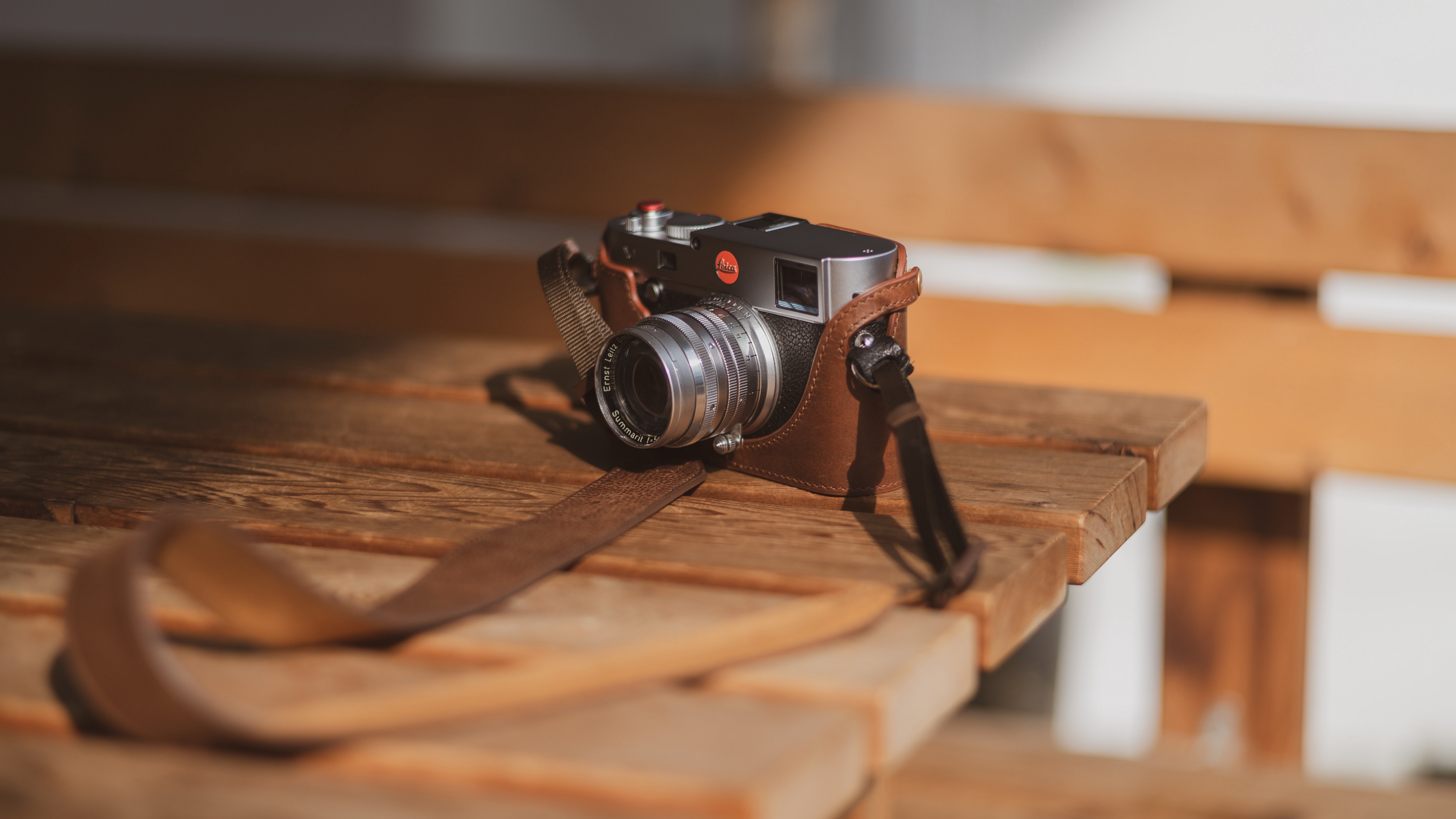 Description: A camera sitting on a wooden table with a strap around it's neck and a wooden bench behind it.