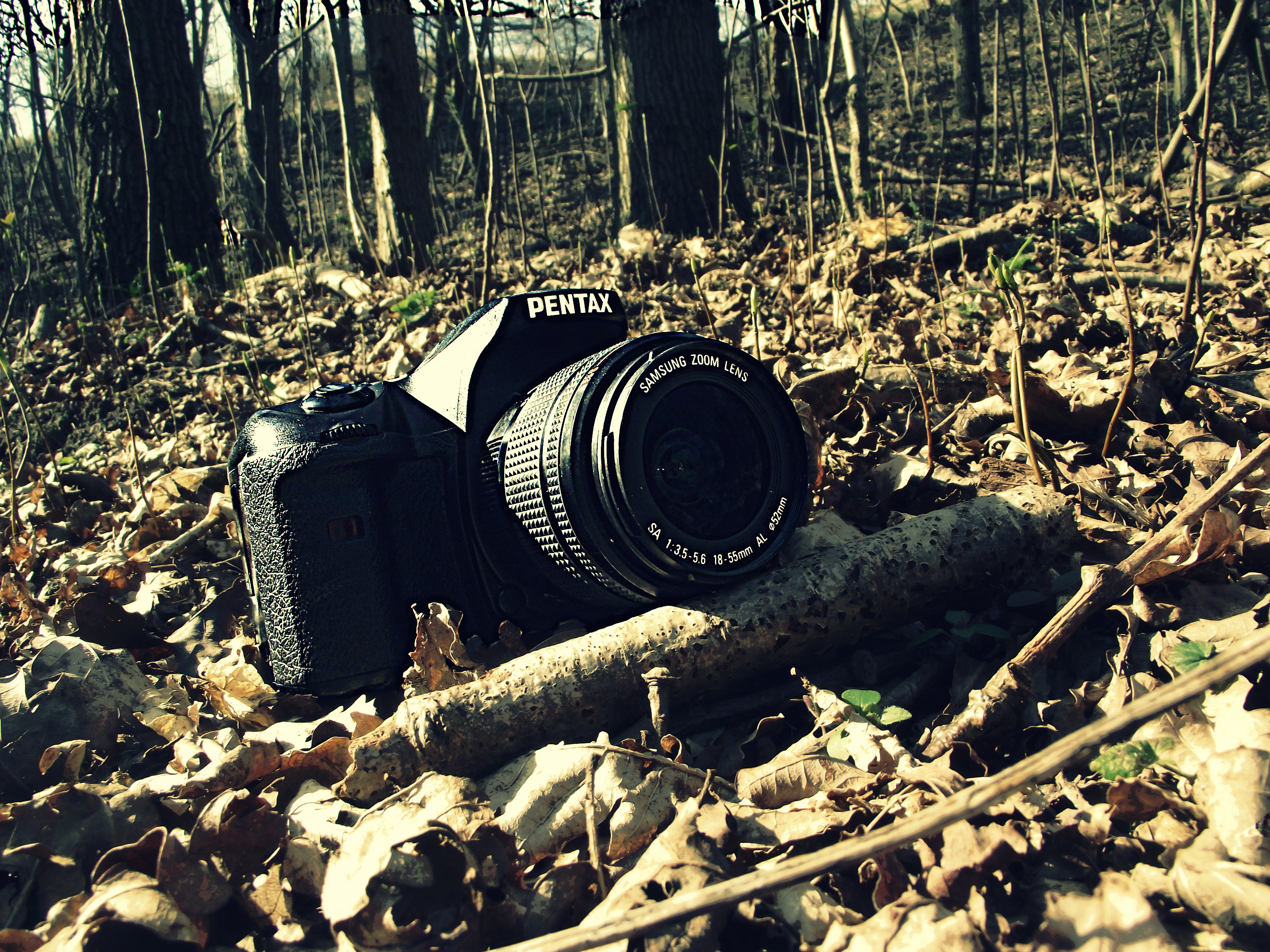 Description: A camera sitting on the ground in the woods with leaves on the ground and a log in front of it.