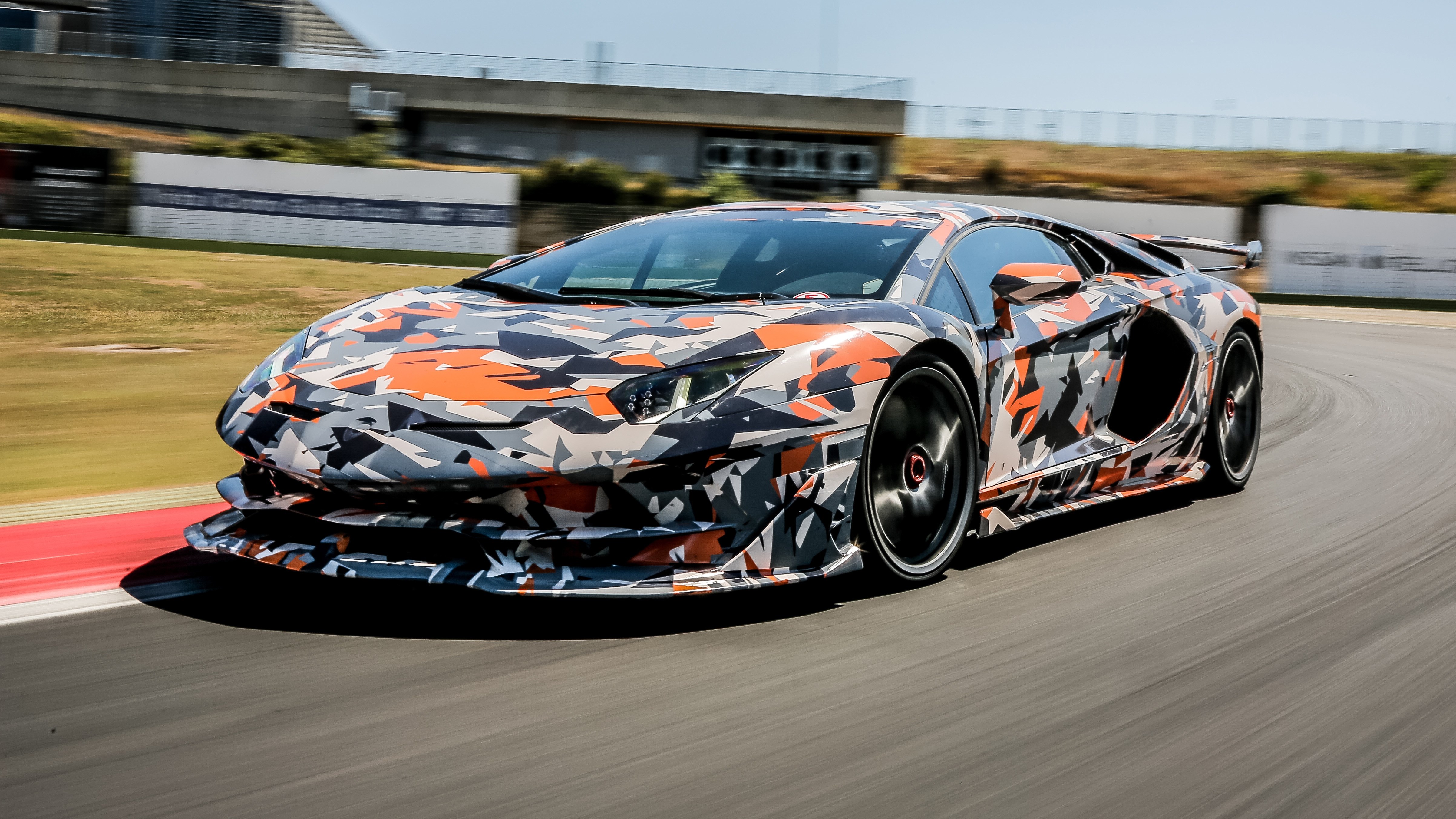 Description: A camouflaged sports car driving on a track with a sky background and grass in the foreground.