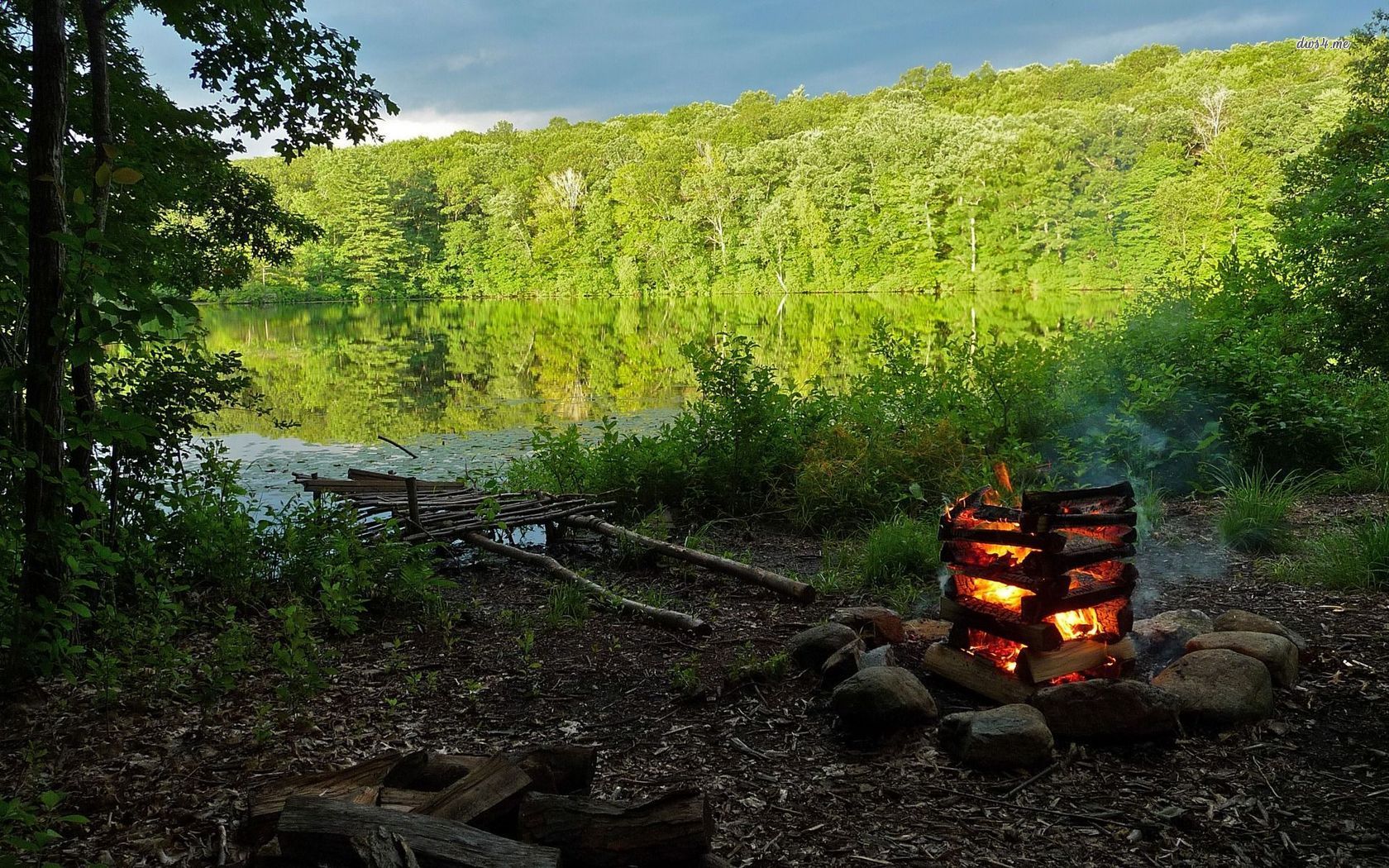 Description: A campfire is lit in the woods by a lake with a forest in the background and a forest fire pit in the foreground.