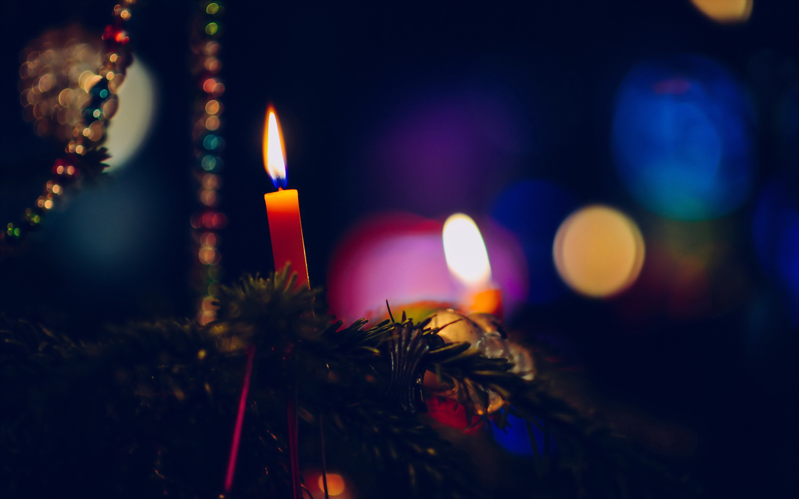 Description: A candle is lit in a dark room with a christmas tree branch and other decorations around it and a blurry background.