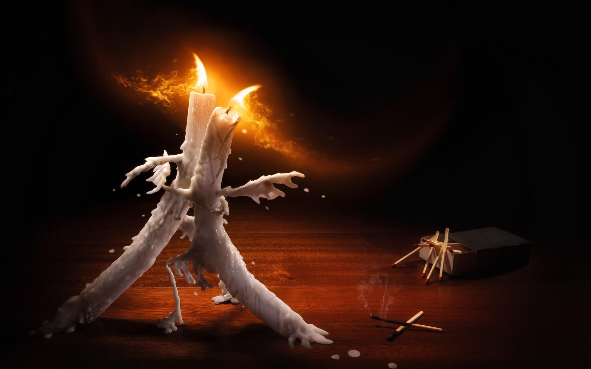 Description: A candle with a flame coming out of it on a table next to a box of matches and a box of matches.