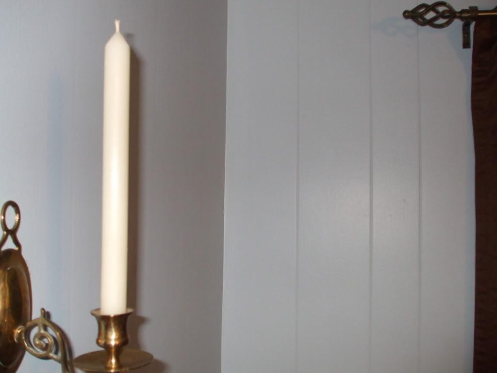 Description: A candle is lit on a wall next to a mirror and a wall sconce with a curtain.