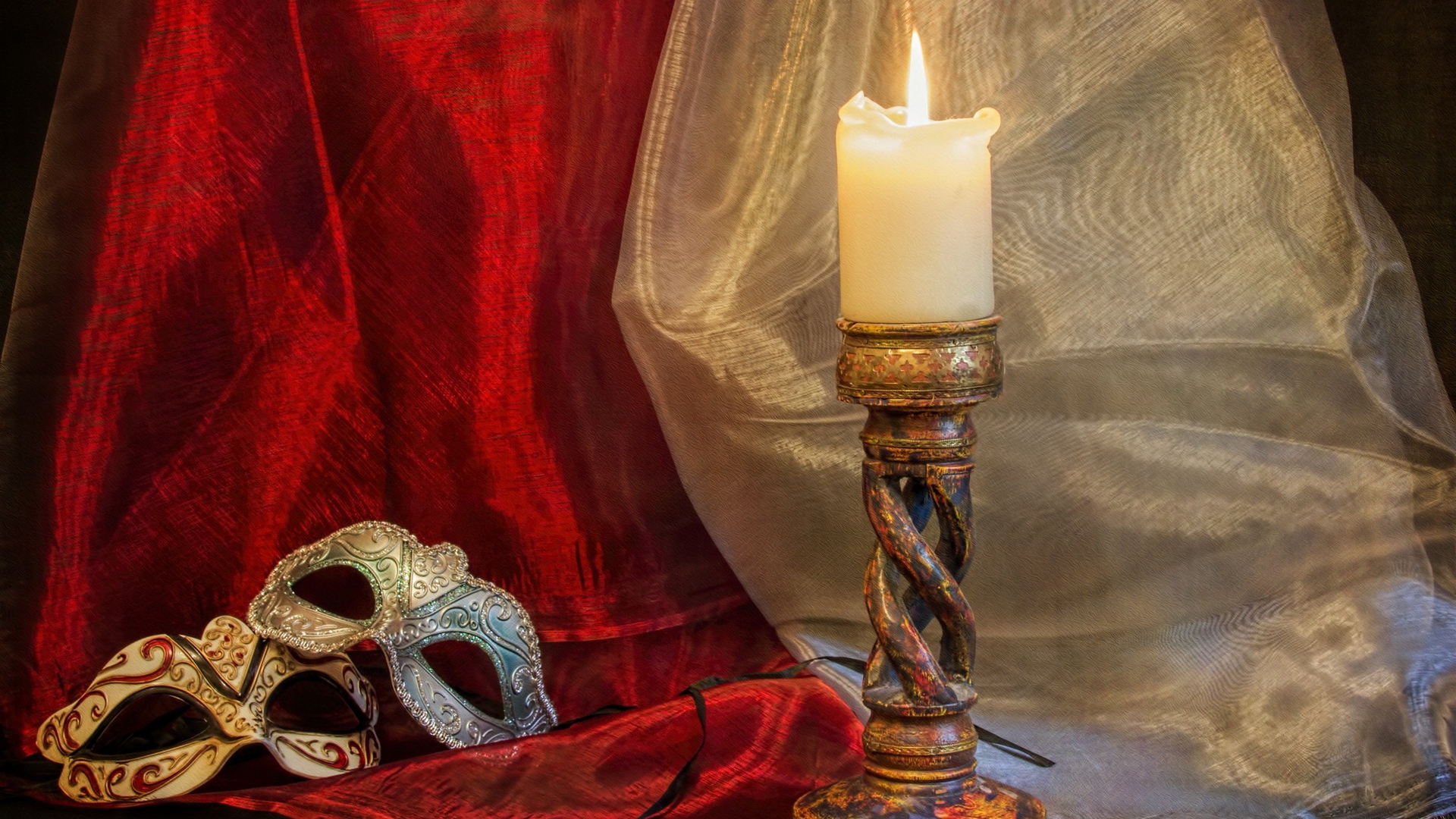 Description: A candle and a mask on a table with a red cloth behind it and a red curtain behind it.