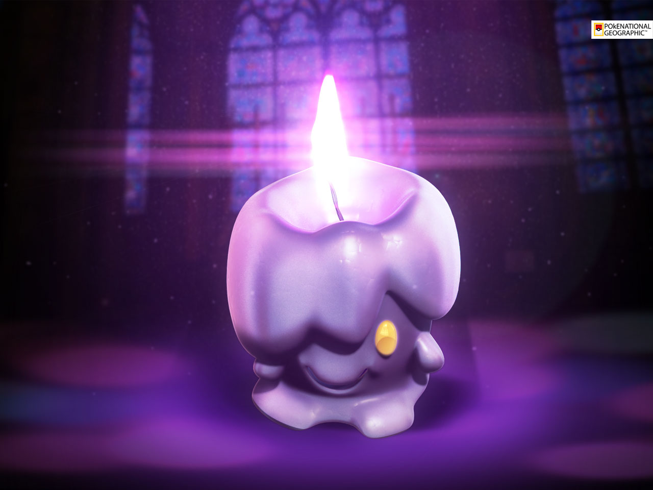 Description: A candle with a purple light shining on it in a dark room with a window in the background and a purple light shining on it.