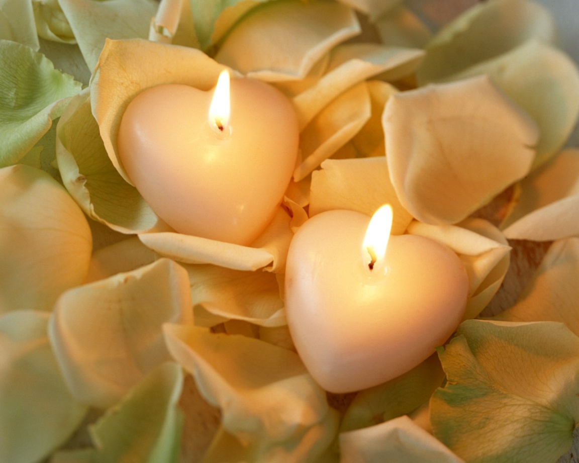 Description: Two candles are lit in a bowl of flowers and petals on a table top with petals around it and a green leaf.