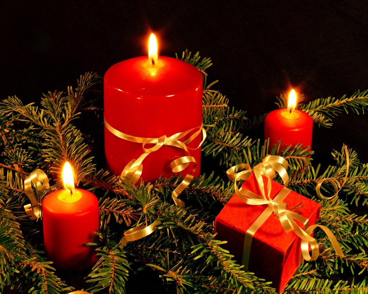 Description: A group of candles with presents on a table next to them and a christmas tree branch with a lit candle.