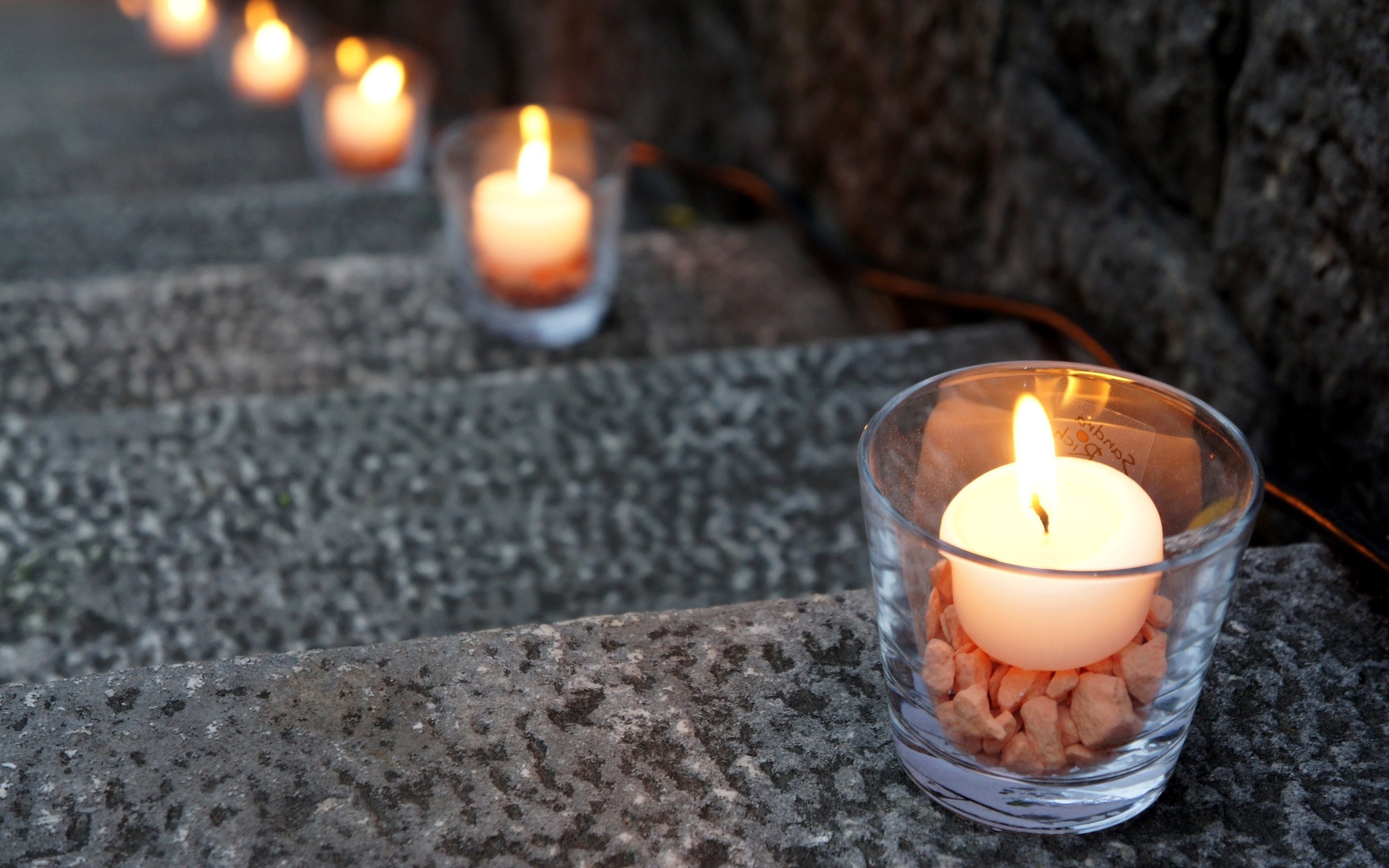 Description: A group of lit candles sitting on top of a stone step next to a wall with rocks in it.