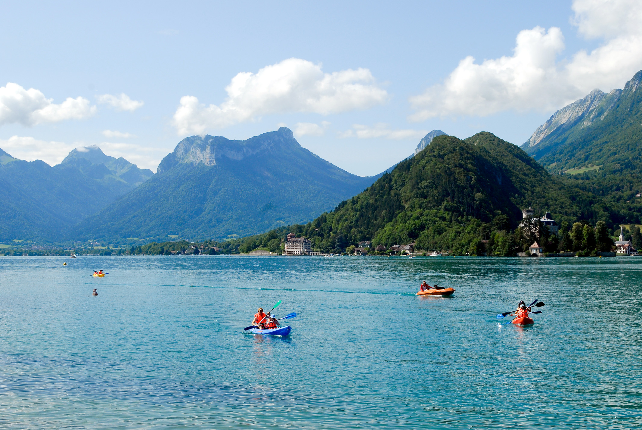 Description: A group of people in canoes paddling on a lake with mountains in the background and a town on the shore.