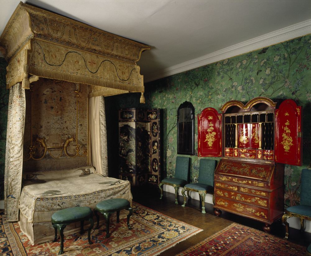 Description: A bedroom with a canopy bed and a rug on the floor and a dresser and a bed with a canopy.
