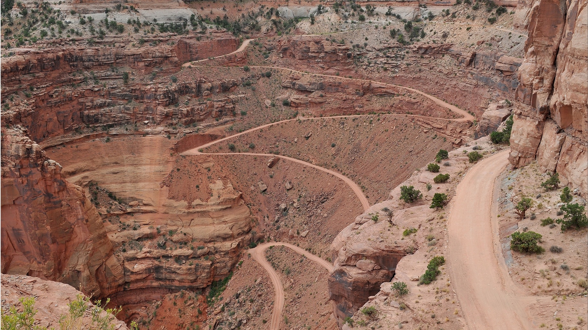 Description: A dirt road in the middle of a canyon with a dirt road going through it and a cliff in the background.