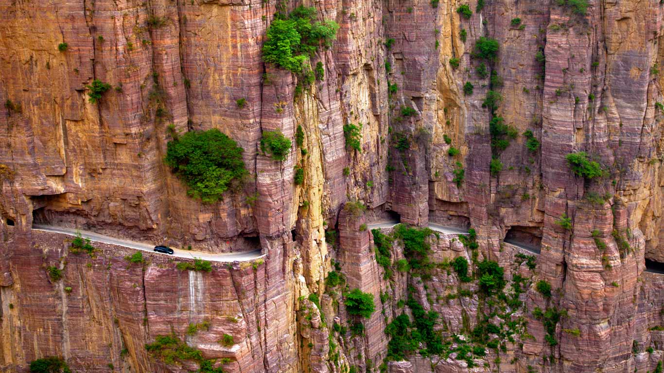Description: A road going through a canyon with a cliff face in the background and trees growing on the sides of the cliffs.