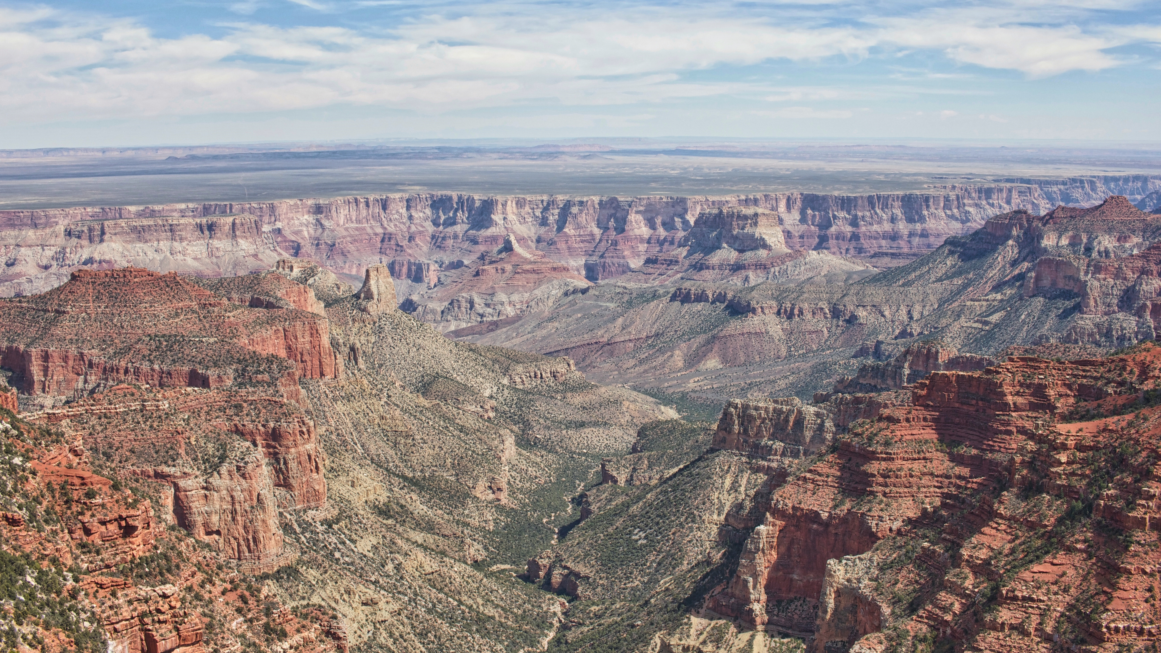 Description: A view of a canyon with a sky background and clouds in the sky above it.