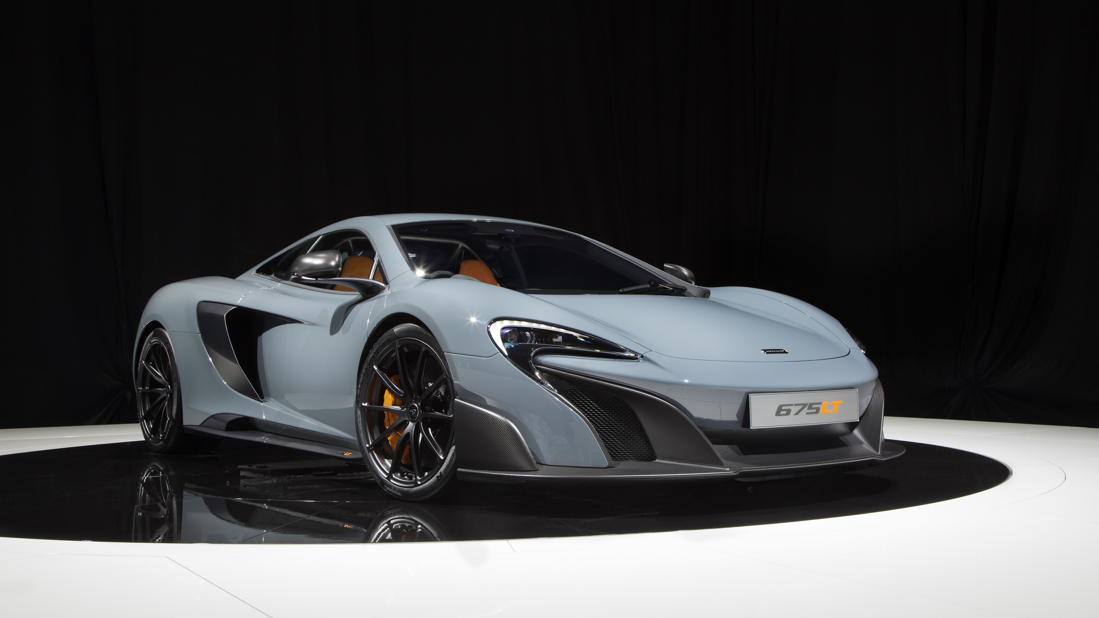 Description: A car is shown on a black and white floor with a black background and a black curtain behind it.